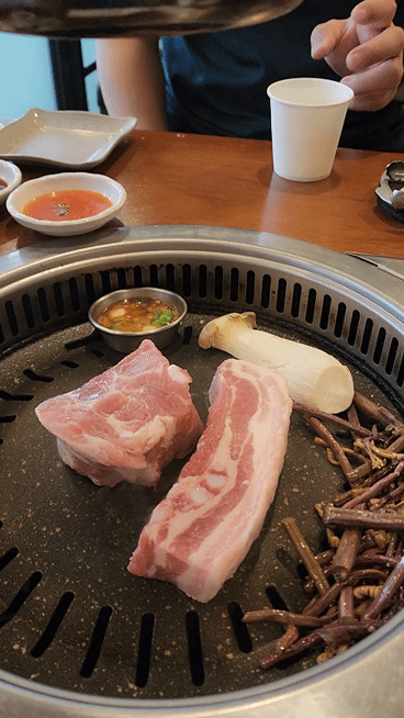 삼겹살을 먼저 굽고 목살을 구워주셨는데요 다 구워진 고기는 오버쿡 되지 않게 옆에 빼주셔서 제일 맛있을 때 먹을 수 있게 해주셔서 좋았어요.