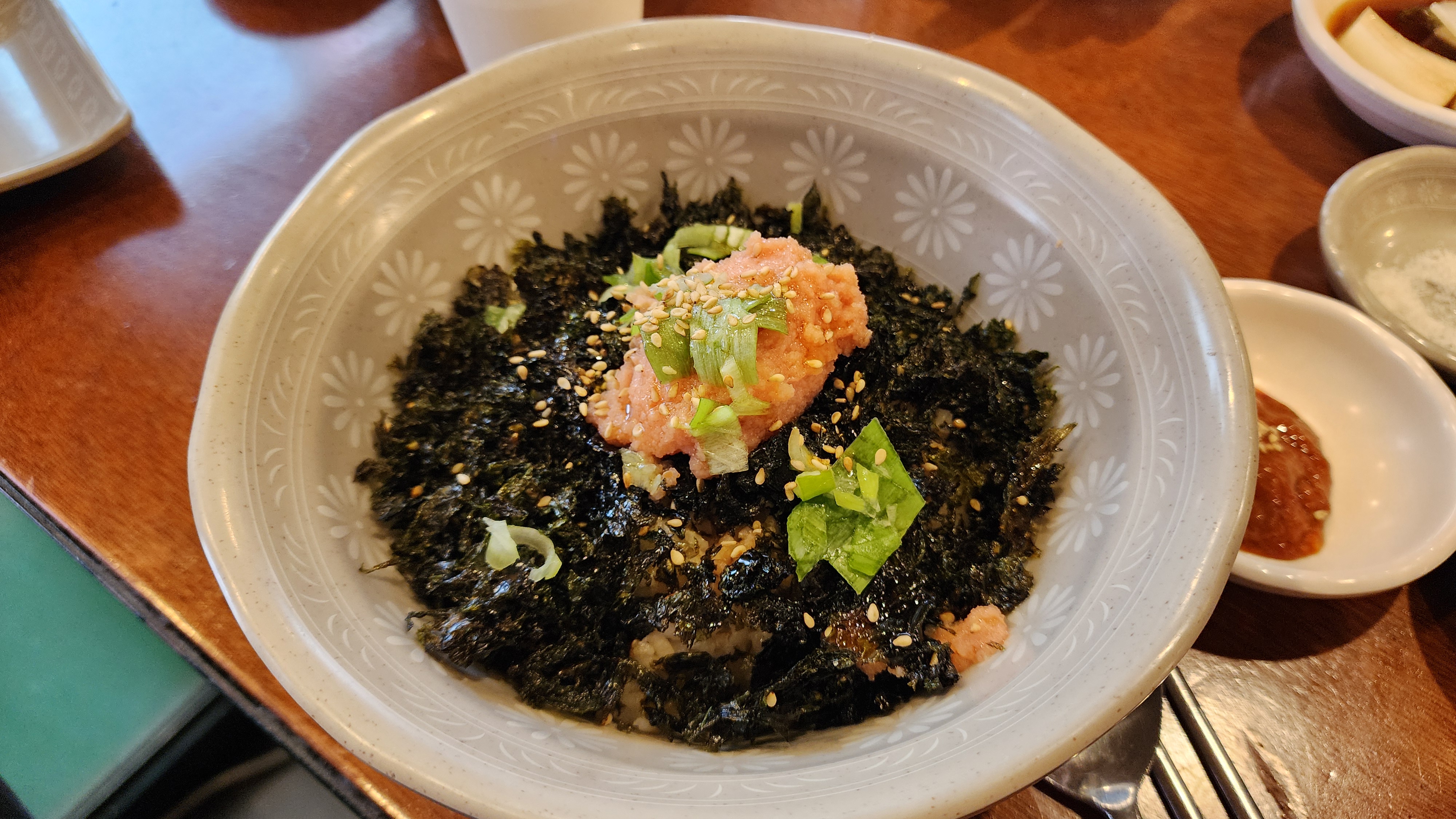 고소한 김가루에 짭짤한 명란젓이 비벼먹기 딱 좋게 나오는데요 동글이는 고반명란밥 맛있다며 집에서 또 해줬음 좋겠다고 해서 다음에 또 고반식당가면 고반명란밥은 또 시켜줘야겠구나 싶었어요.