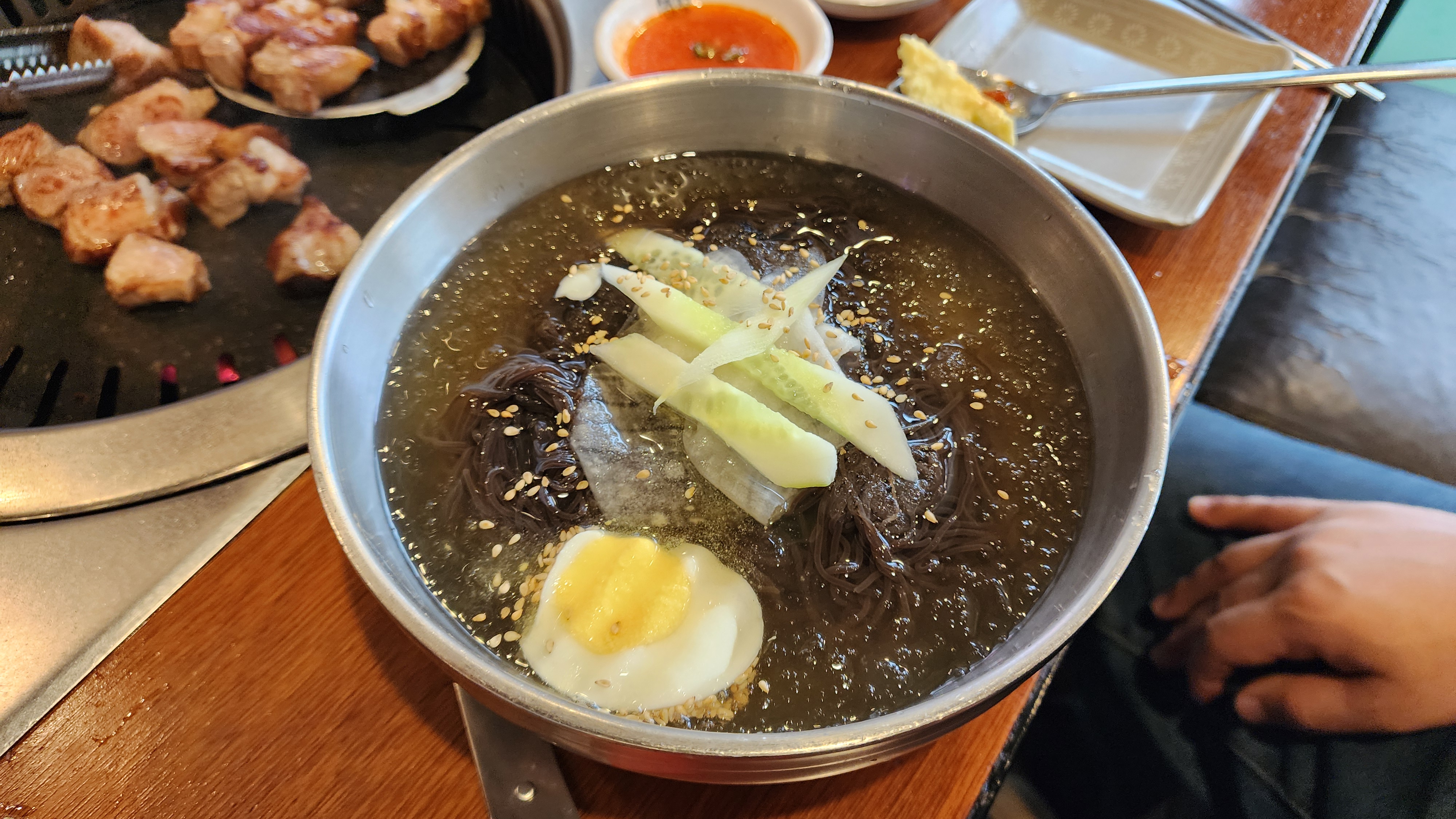 고기랑 물냉면 같이 먹는걸 좋아해서 물냉면도 주문했는데요, 삶은달걀, 무절임, 오이 고명이 올라갔고 육수에 살얼음이 잘 얼어있어서 맛있었어요.