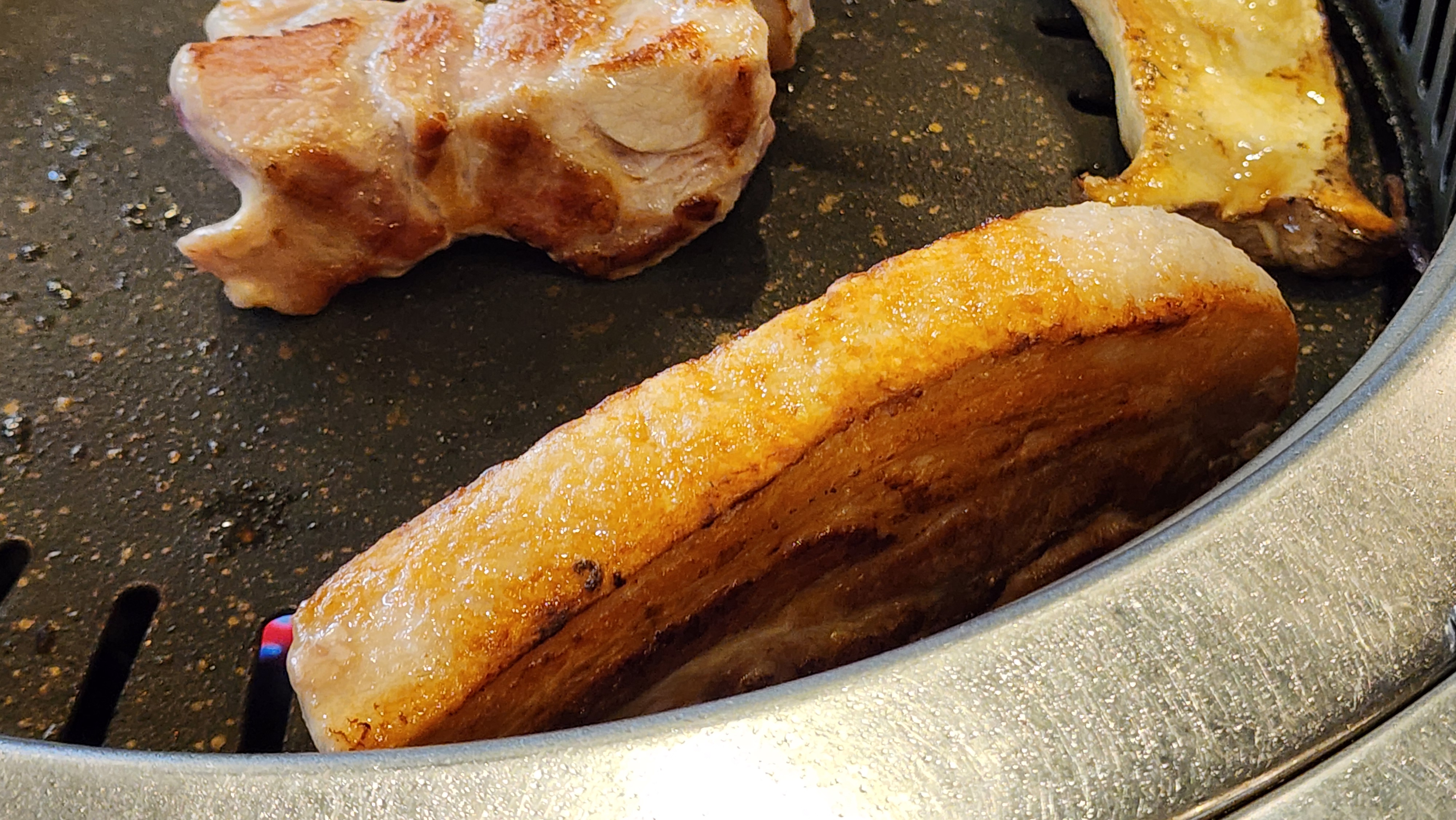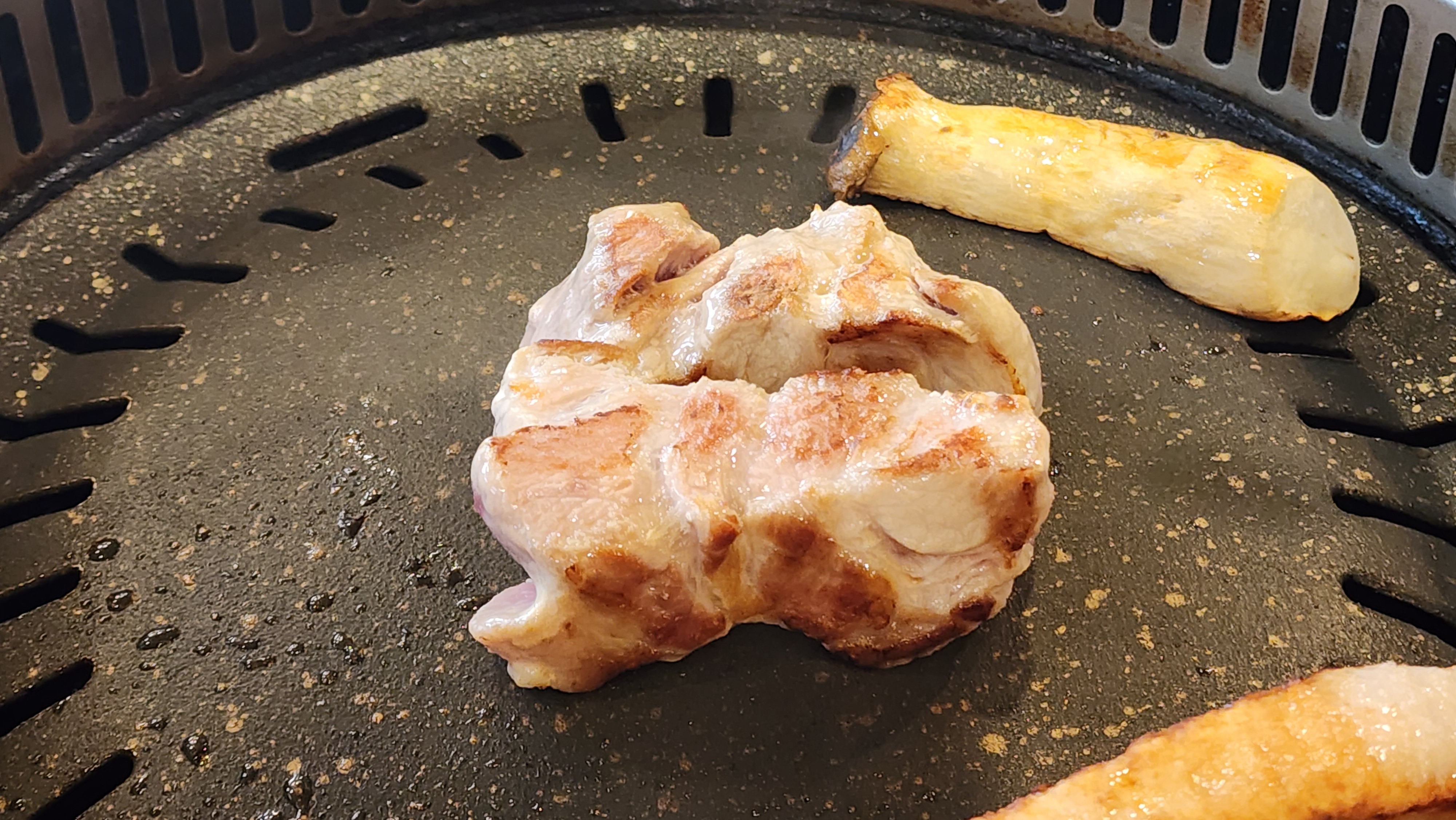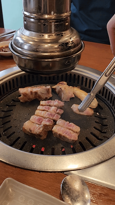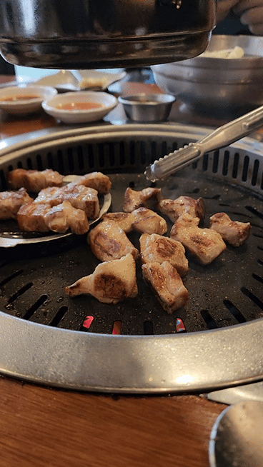 삼겹살을 먼저 굽고 목살을 구워주셨는데요 다 구워진 고기는 오버쿡 되지 않게 옆에 빼주셔서 제일 맛있을 때 먹을 수 있게 해주셔서 좋았어요.