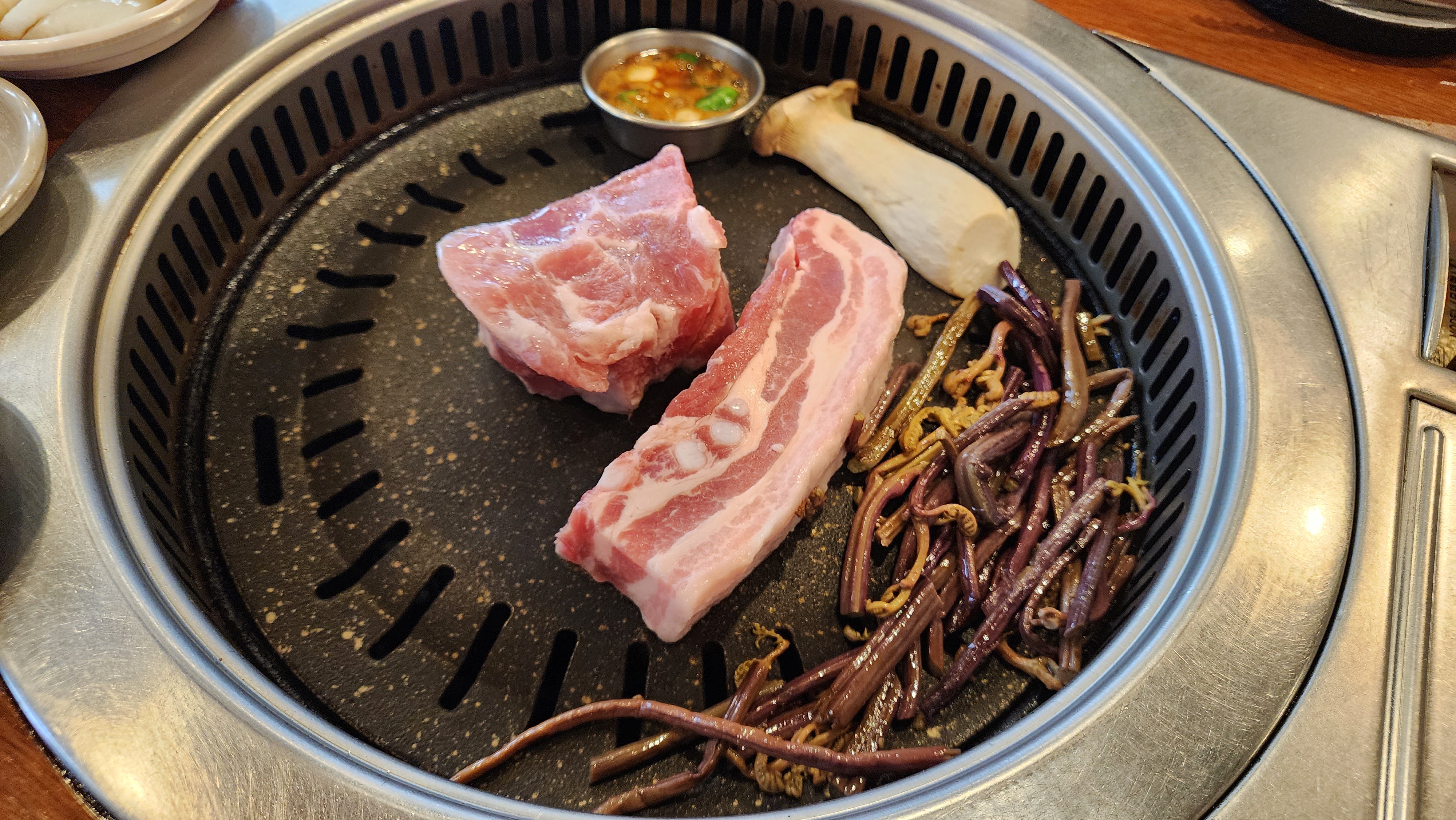 달궈진 불판에 고사리부터 볶아서 한켠에 두고 숙성생목살과 숙성생삼겹살, 버섯을 올려 구워주셨어요.