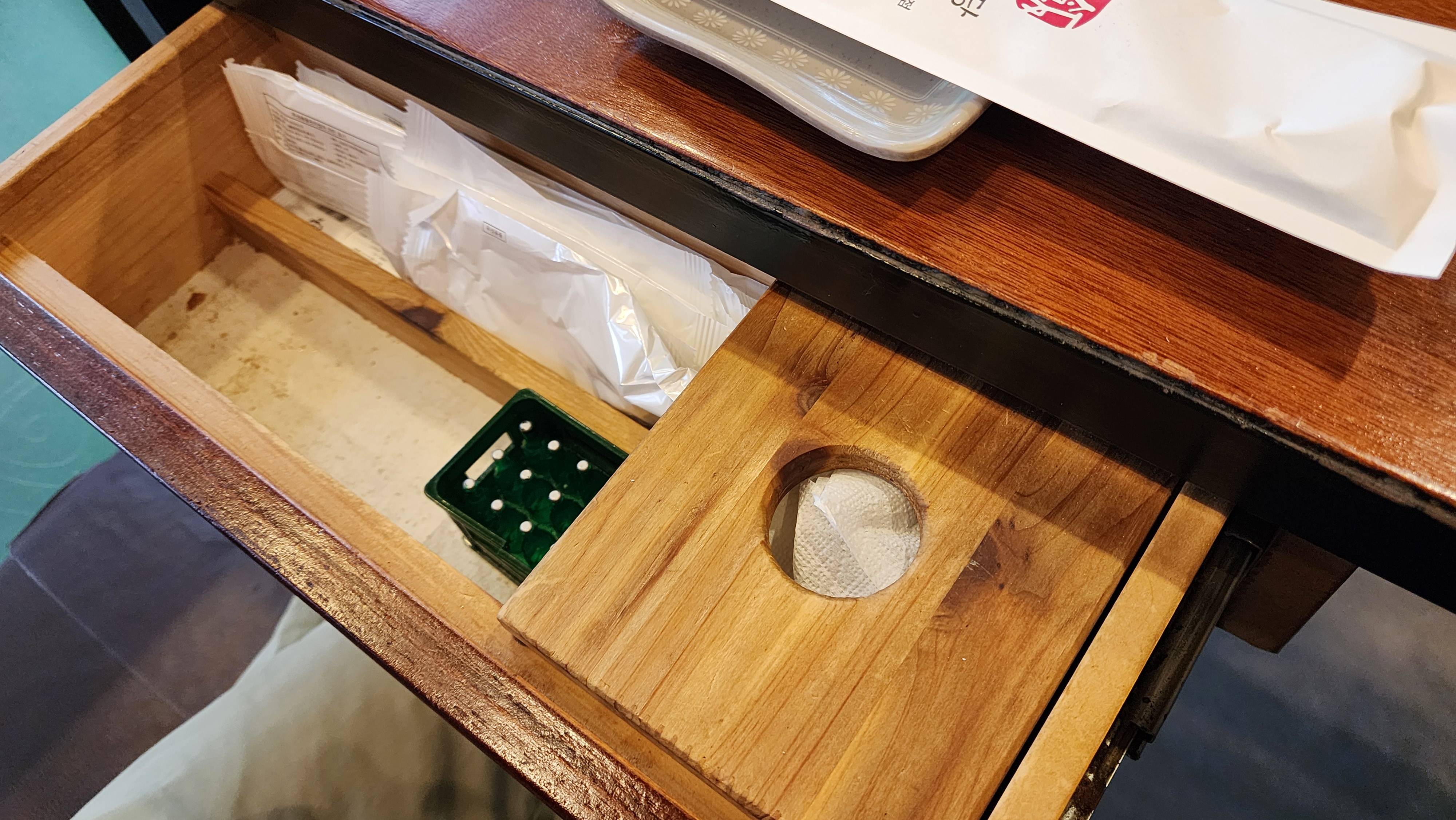 테이블 서랍을 열었더니 병따개, 물티슈, 냅킨 등이 들어있었고 직원분들 부르는 벨은 테이블에 붙어있었어요.