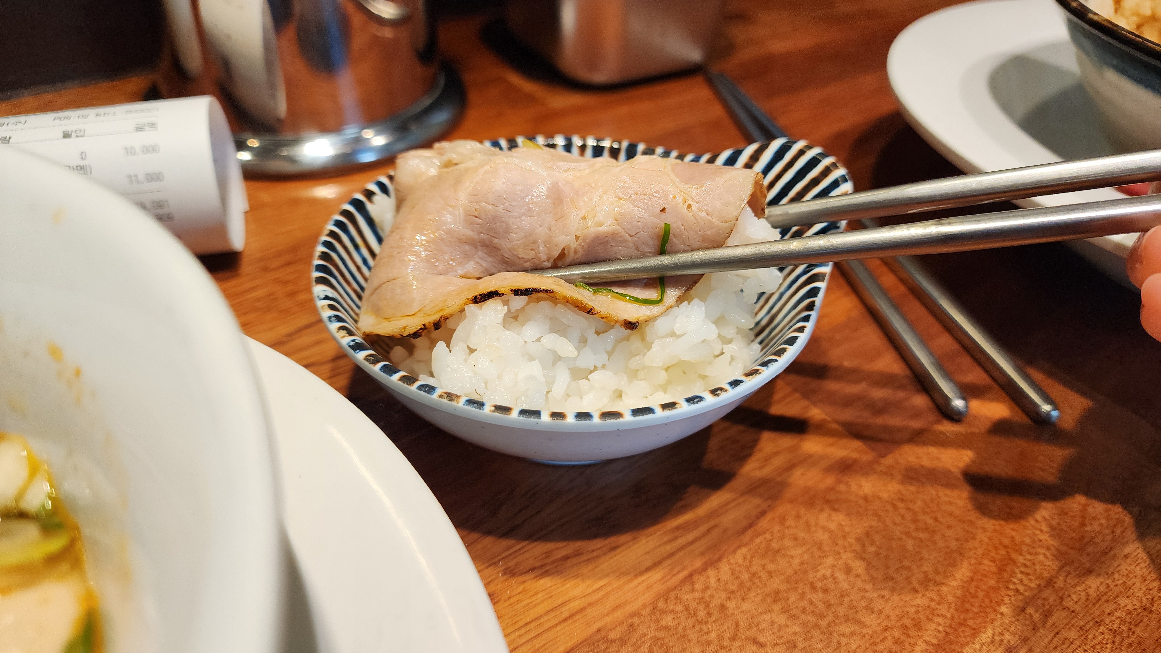 저는 무료 공깃밥 받아서 차슈에 이렇게 싸먹는걸 좋아하는데요 매운 쇼유라멘의 칼칼한 맛이 차슈에 베어들어서 더 맛있었어요.