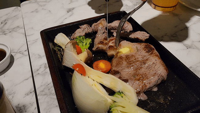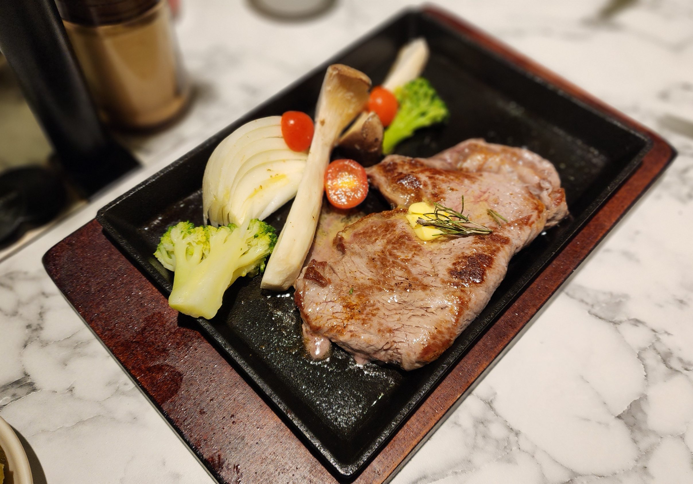 브로콜리, 양파, 버섯, 방울토마토가 곁들여 나왔고 채끝 스테이크 위에는 버터와 로즈마리가 올려져 있었어요.