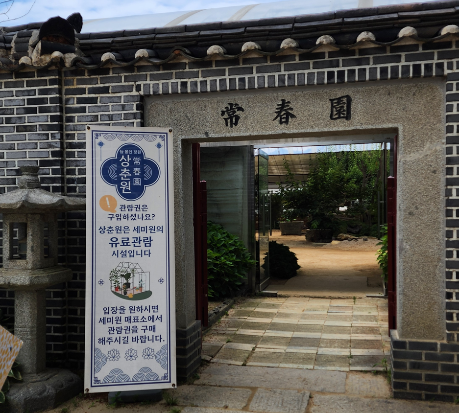 늘 봄과 같은 뜰이라는 뜻으로 매화와 동백을 주제로 한 실내 정원이었는데요 민속촌과 같이 꾸며진 곳이었어요.