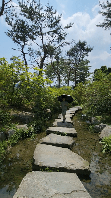 작은 실개울이 흐르고 징검다리가 있어서 동글이가 즐겁게 건넜어요.