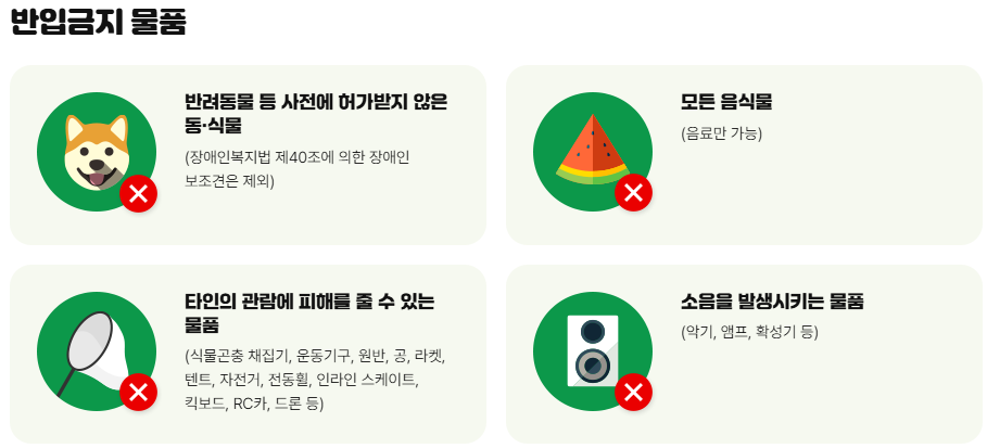 타인의 관람에 피해를 줄 수 있는 물품 및
