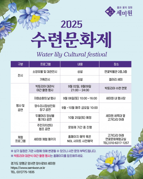 게다가 9월 1일부터 10월 31일까지는 <2025 세미원 수련 문화제> 가 열려서 다양한 행사 및 공연이 진행된다고 하니 찾아가보시면 좋을 것 같아요.