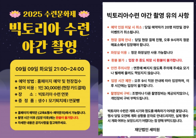 행사 및 공연 중 내일인 9월 9일(화), 16(화)에 빅토리아 수련 연못에서 야간 촬영행사가 있어요.