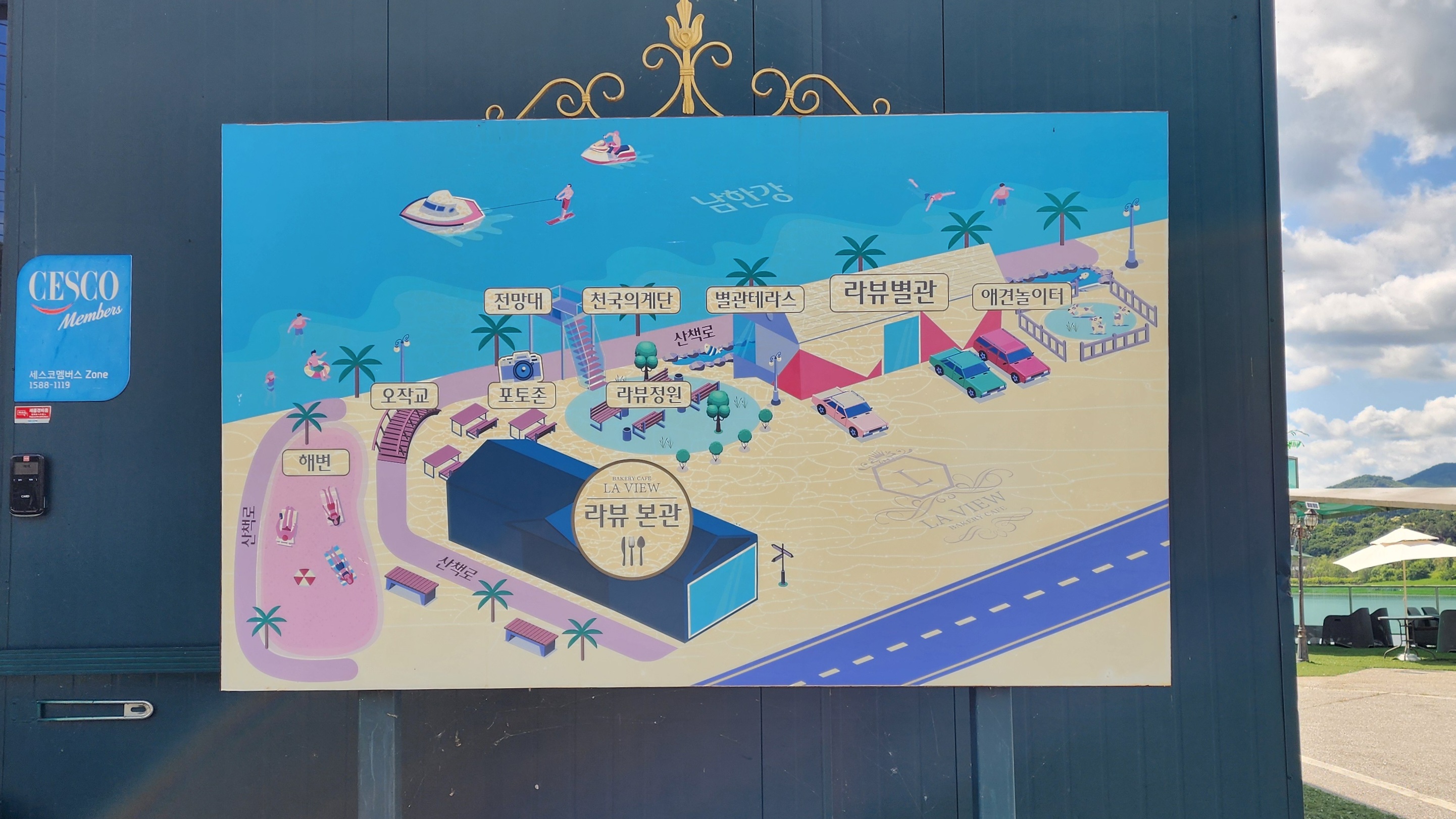 유원지에 있을 법한 안내도까지 있는 라뷰베이커리카페 외관이예요.