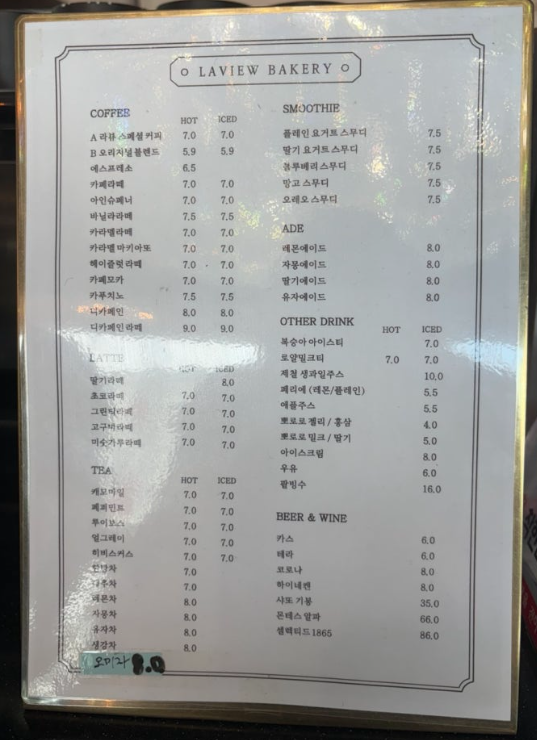 라뷰 베이커리 카페 음료메뉴