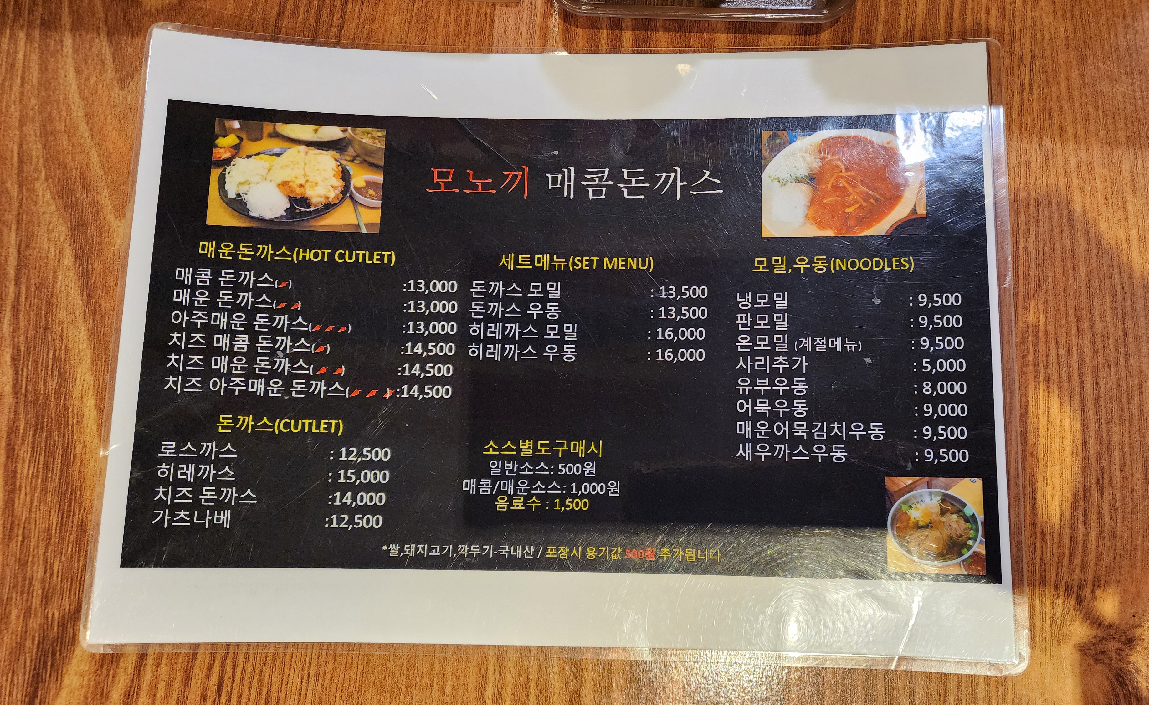 모노끼 매콤돈까스라고 타이틀이 적혀있는 메뉴판이 테이블에 있었는데요 매콤돈까스, 돈까스우동, 판모밀을 주문했어요.