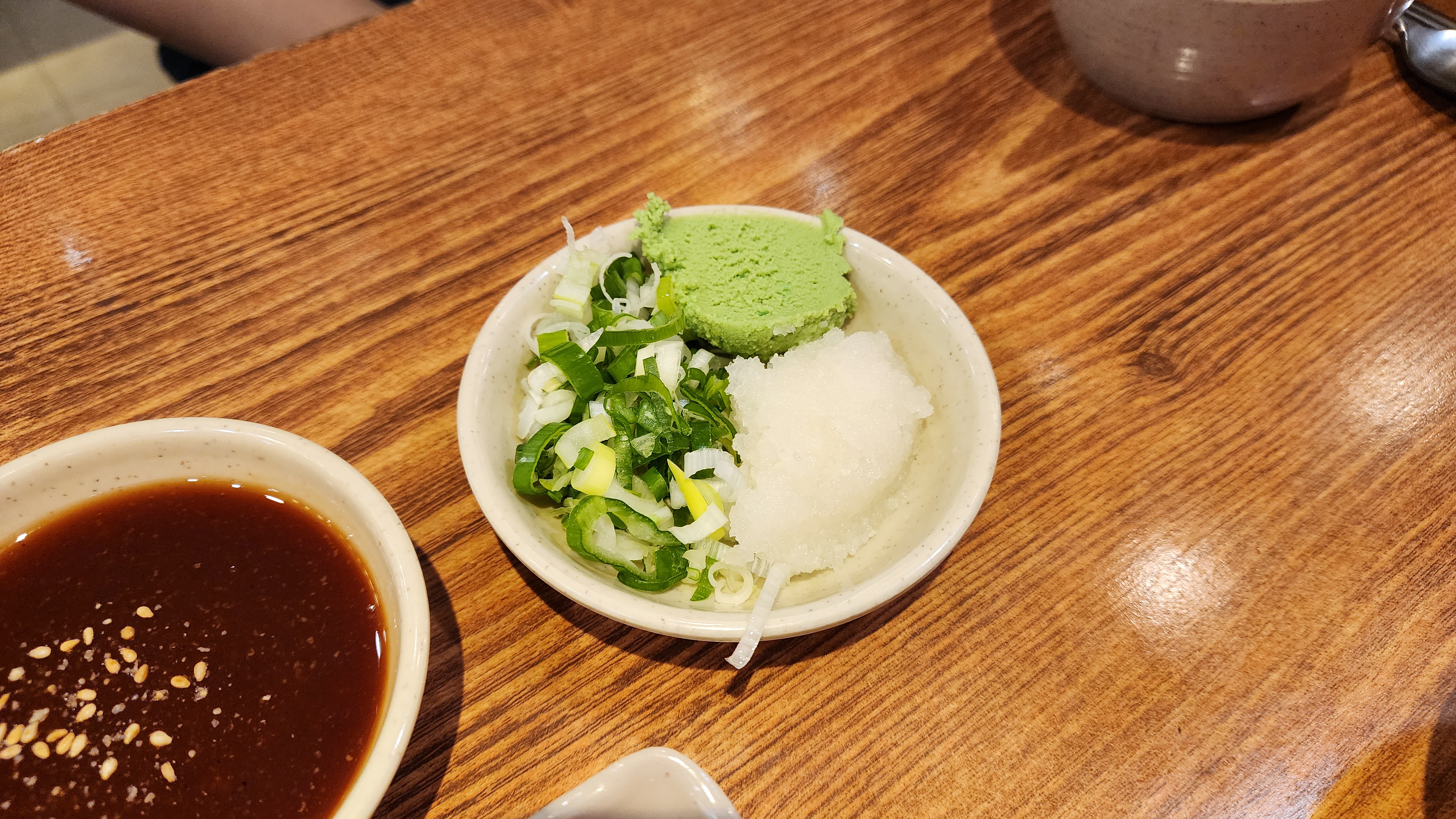 모밀육수에 곁들여먹으라고 와사비, 파, 간 무가 나왔어요.