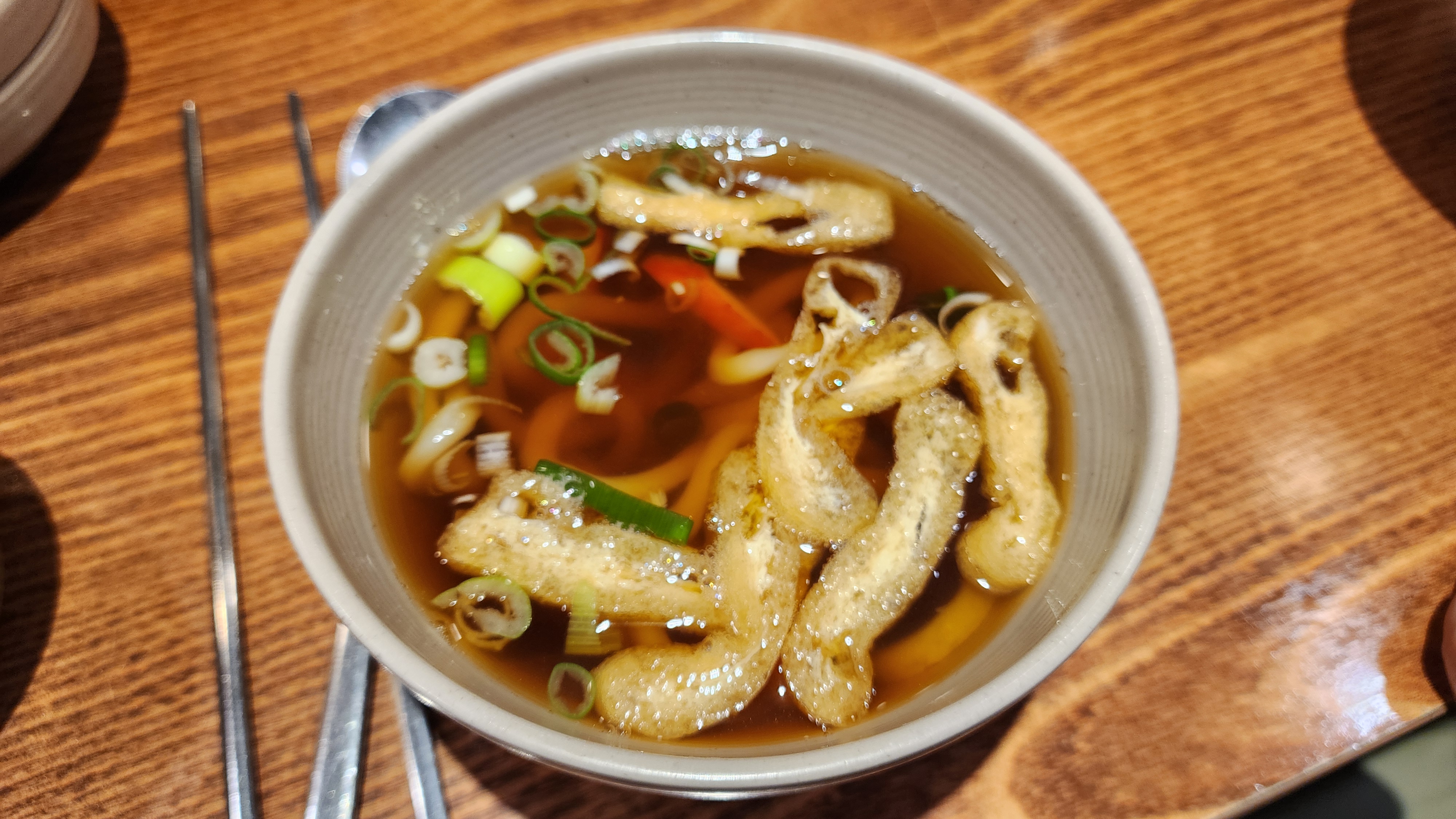 우동도 나왔는데요 유부와 맛살이 고명으로 들어간 평범한 우동이었어요.