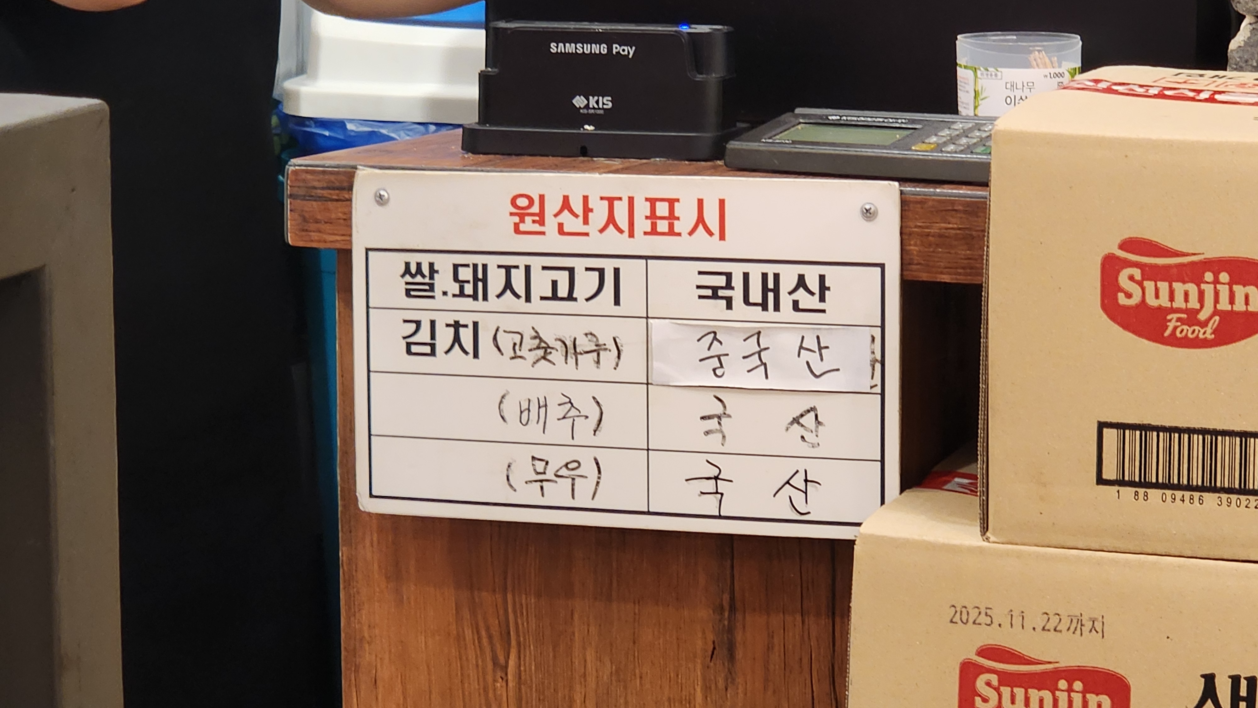 쌀과 돼지고기, 배추, 무는 국내산이었고 김치에 쓰이는 고춧가루는 중국산이었어요.