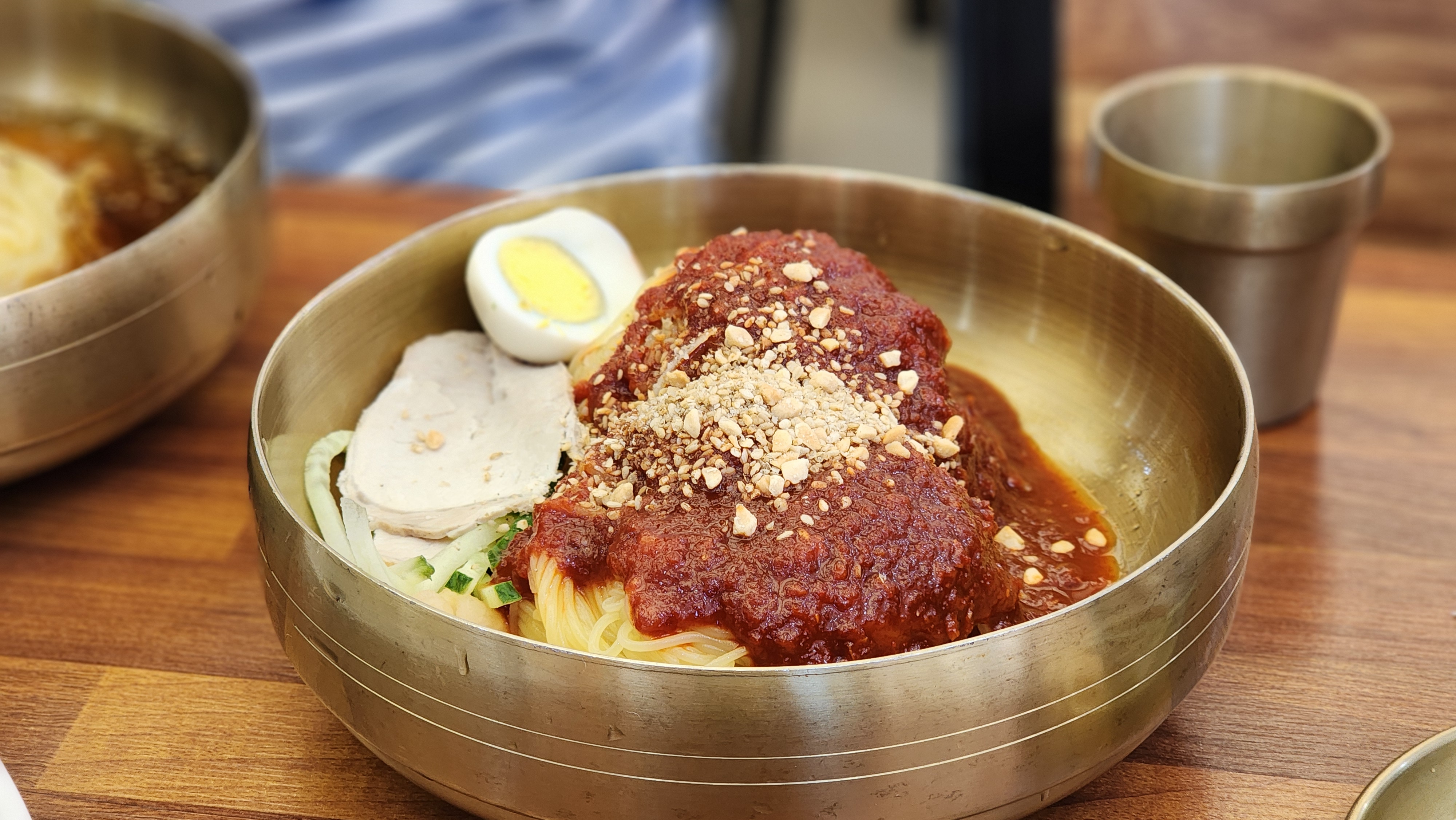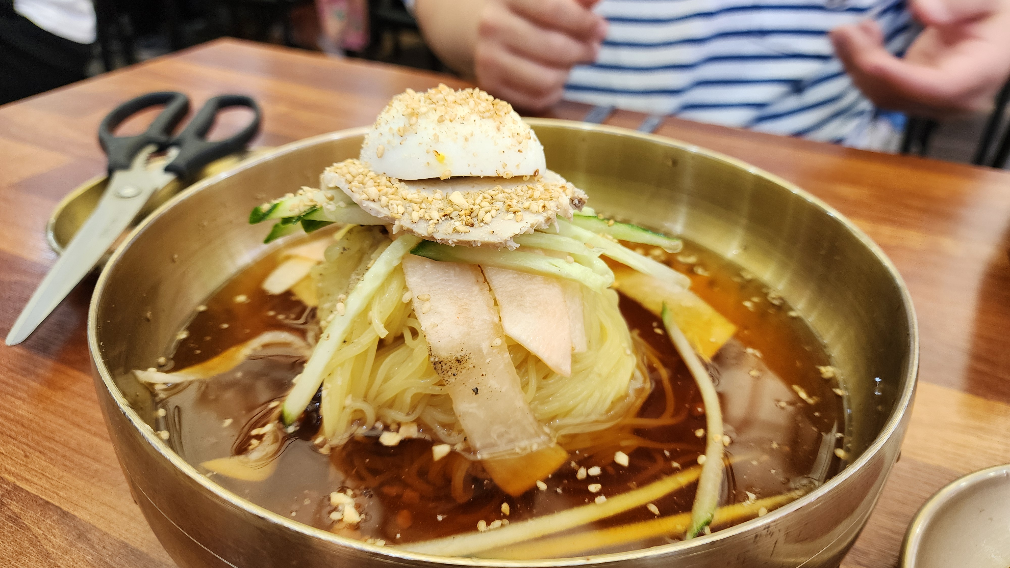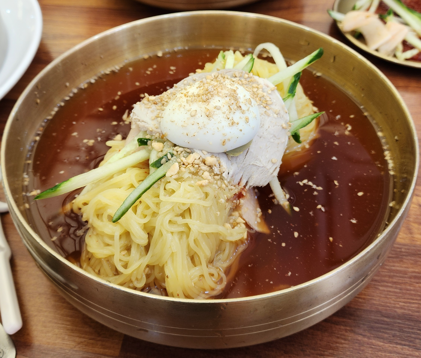 삶은달걀, 고기고명, 오이, 무절임까지 푸짐한 밀면이 나오더군요.