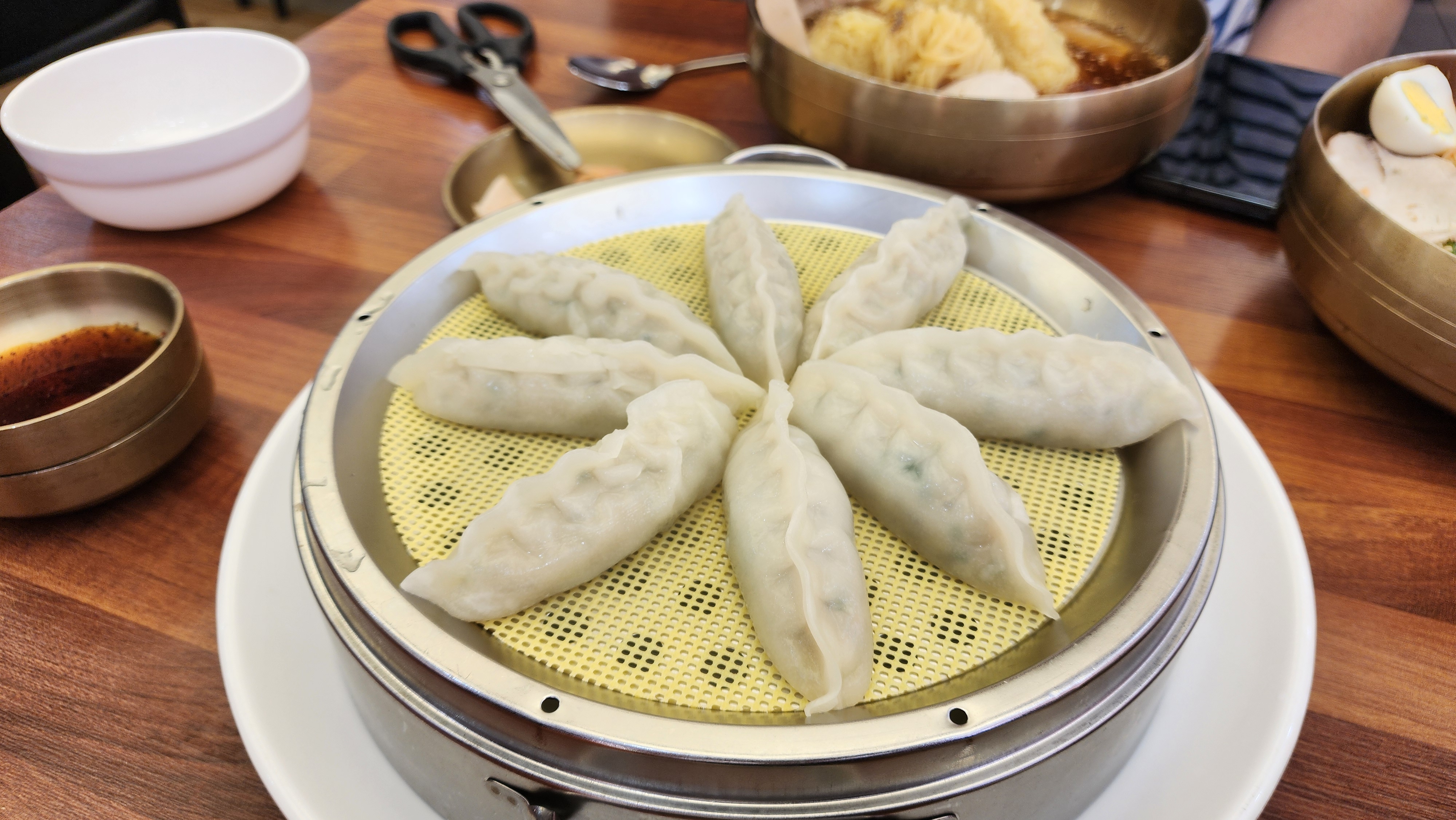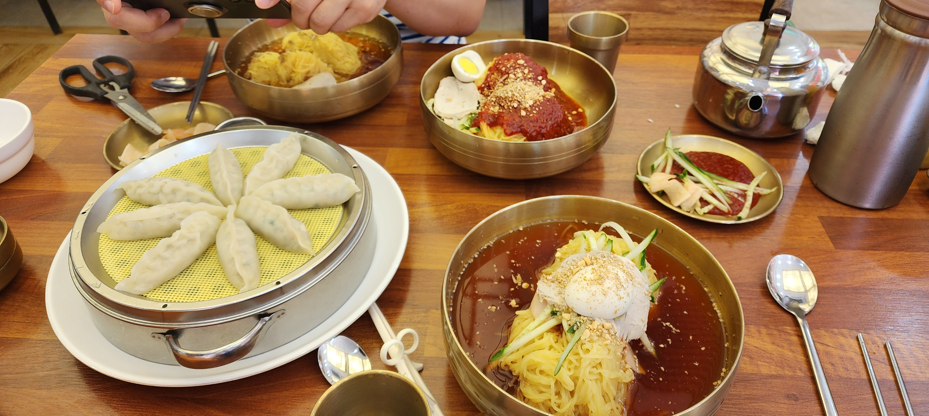 밀면과 만두를 펼쳐놓고 식사하면서 즐거웠답니다.