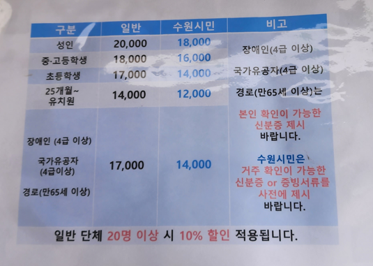 수원시민분들은 할인 받아서 이용하실 수 있는데요 본인 확인이 가능한 신분증을 꼭 지참하셔야 해요.
