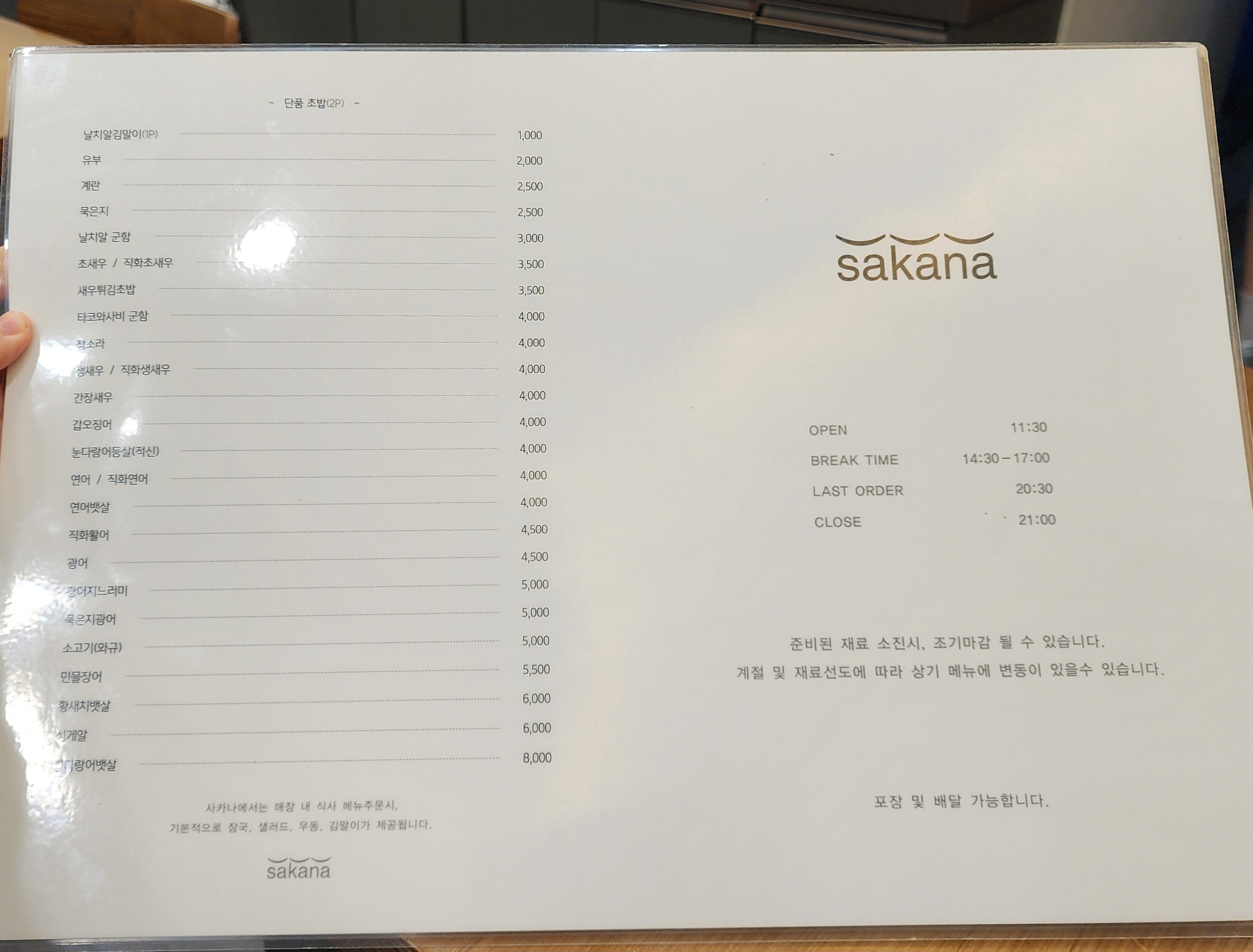 자리에 착석하면 메뉴판을 주시는데요, 사카나는 초밥전문점이라서 초밥 메뉴가 정말 많더라고요.