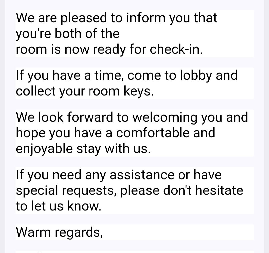 체크인 시간보다 먼저 도착해서 짐을 맡겨두고 관광했는데요, 객실이 정비되어 체크인이 가능할 때 이메일을 보내주셨어요.
