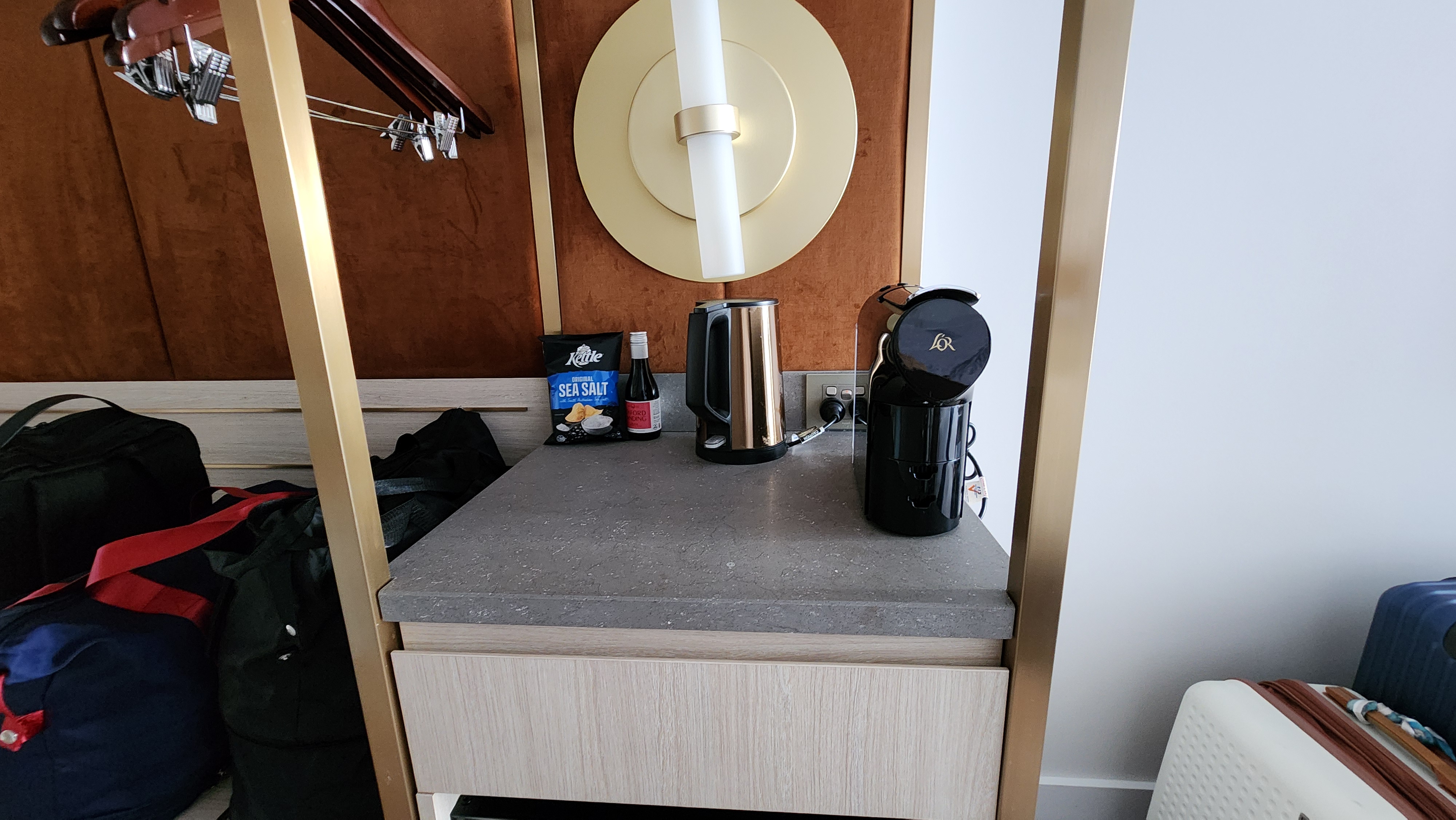 서랍을 열면 와인잔, 머그잔, 인스턴트 커피, 핫초코, 차, 캡슐 등이 들어있었어요.