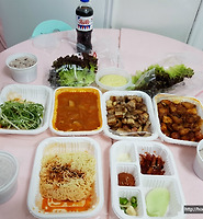 밥솥과 비빔밥을 먹을 수 있는 재료들이 준비되어 있고 비빔쫄면, 해파리냉채, 맛김치 등도 배치되어 있죠.