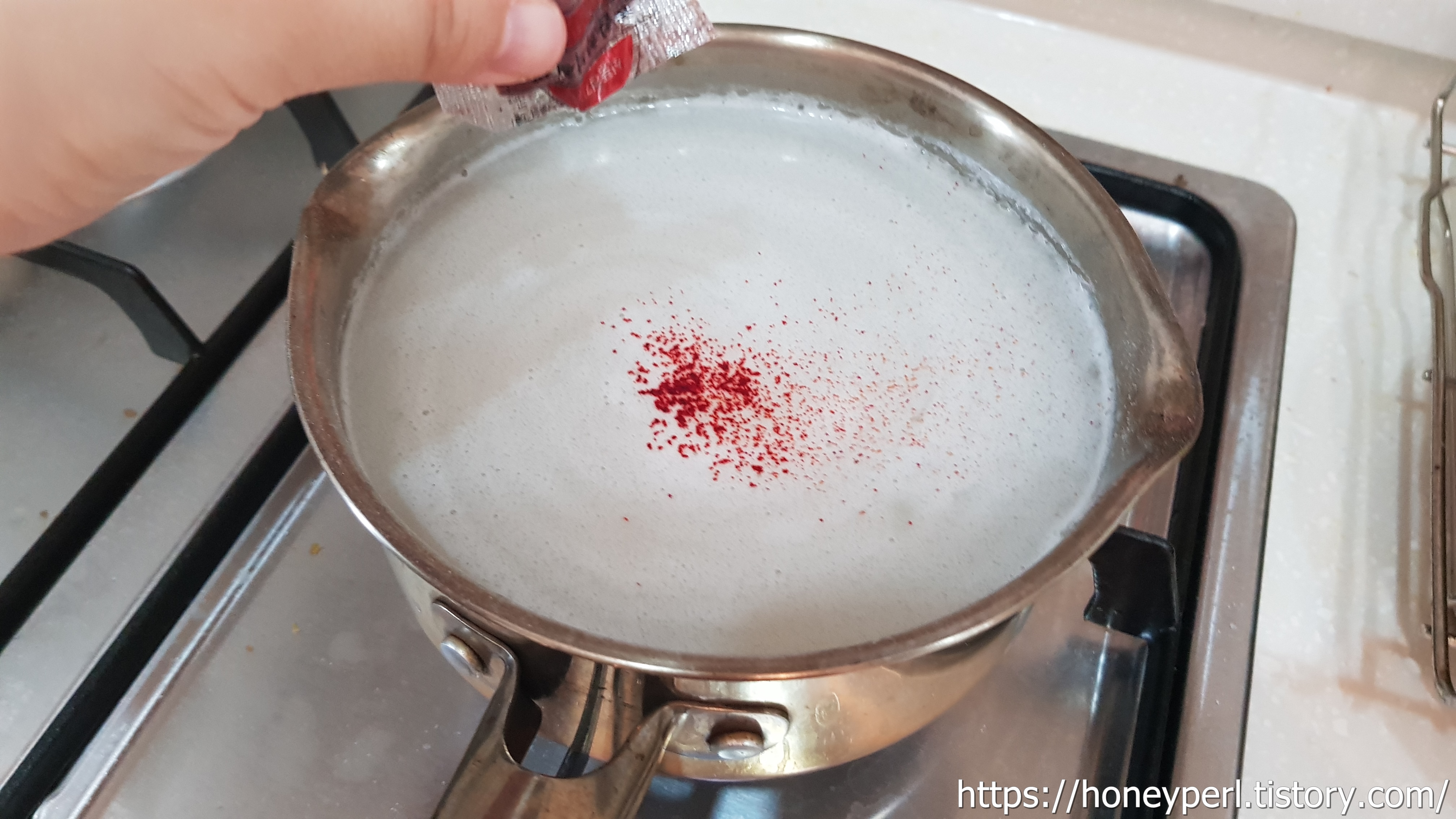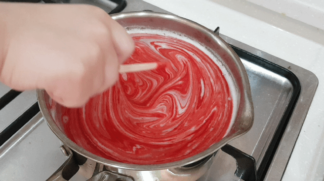바닥에 눌러붙지 않도록 저어주다가 한천가루가 다 녹았을 때 불을 꺼주세요.
