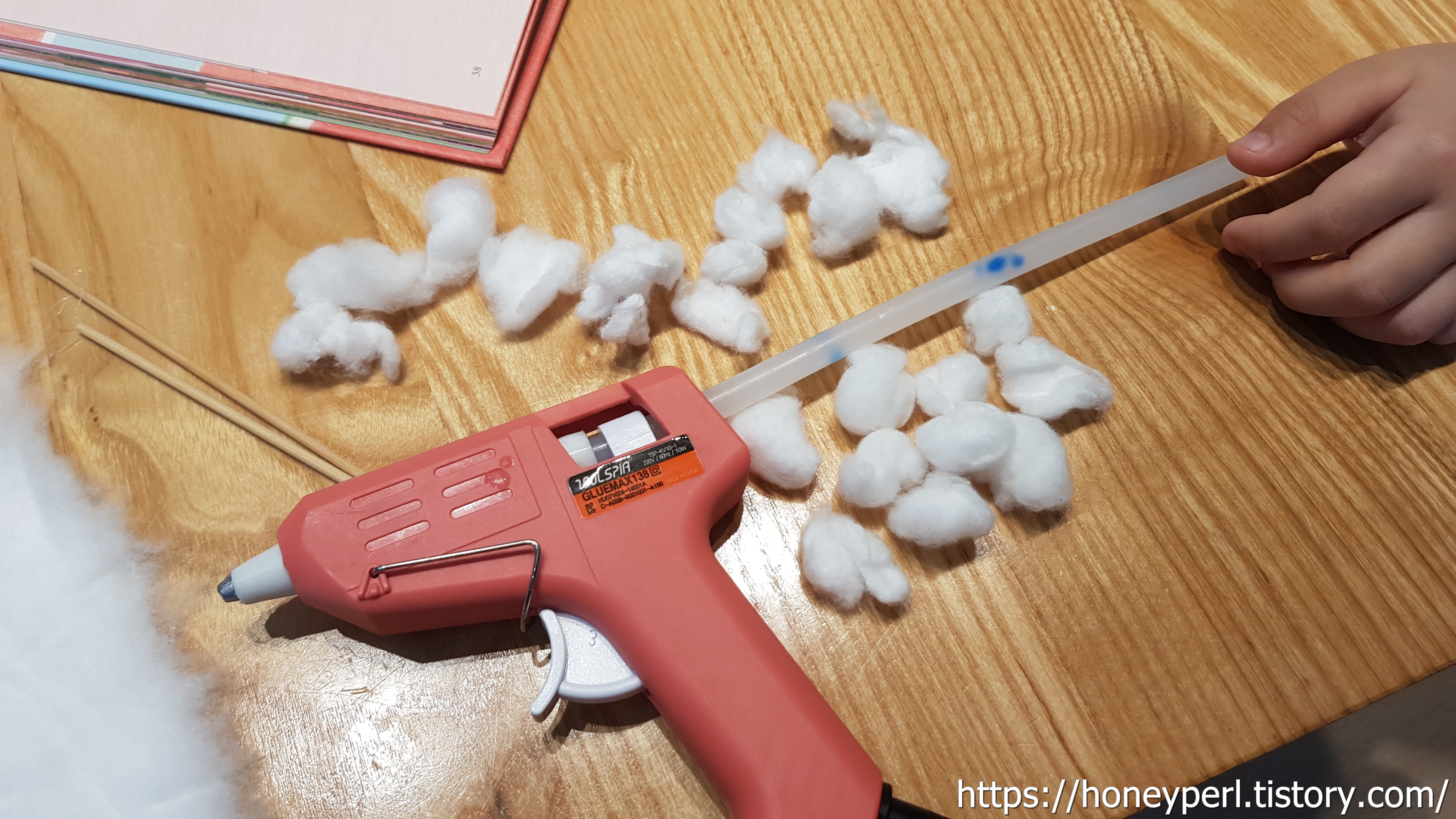 글루건은 뜨거우니 제가 사용해서 탈지면과 꼬치에 쏘아 붙였어요.