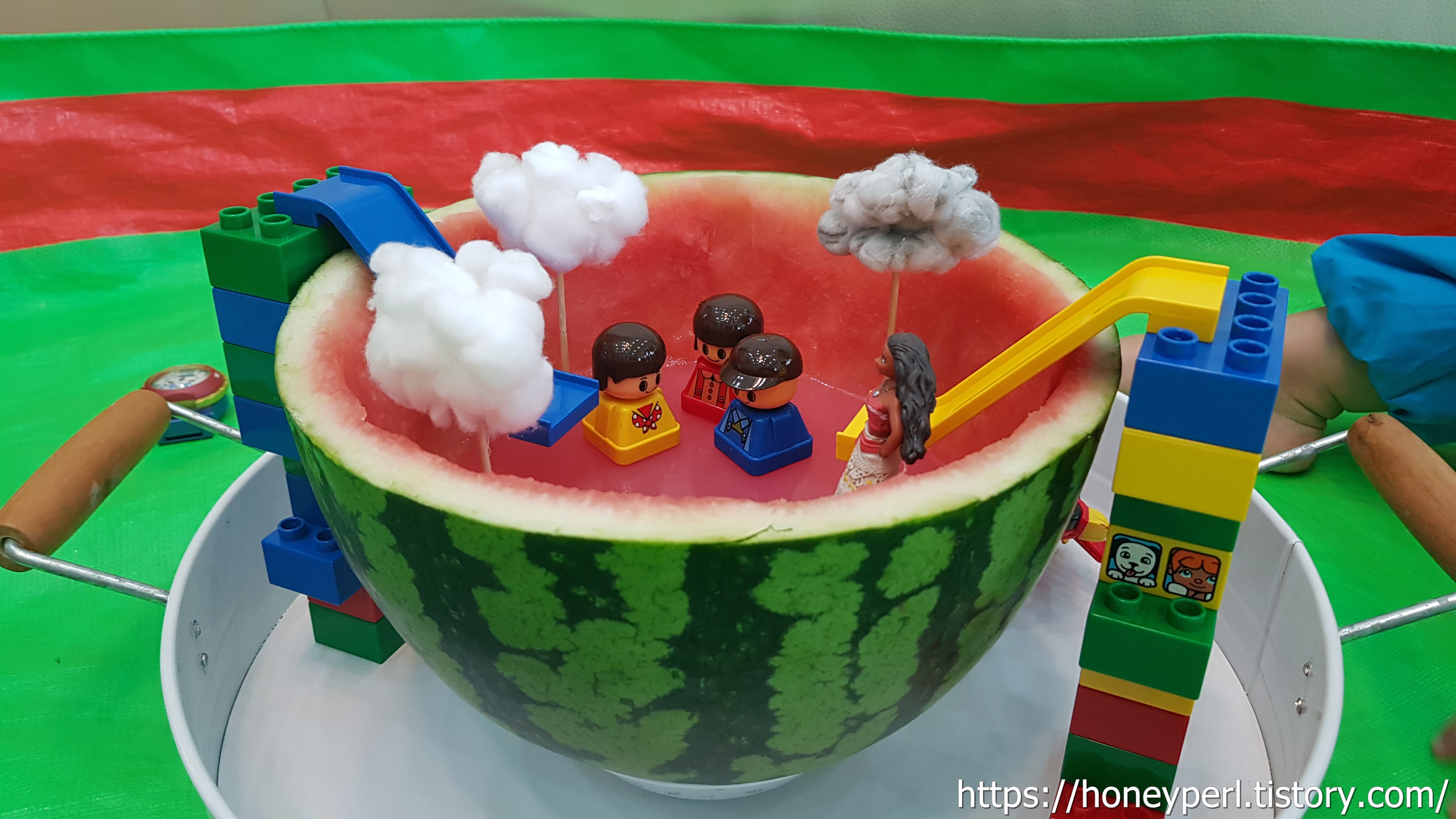 수박수영장이 젤리로 만들어져서 친구들이 신나게 놀지 못하는 느낌이라고 해서 놀이 방법을 바꿔보기로 했어요.