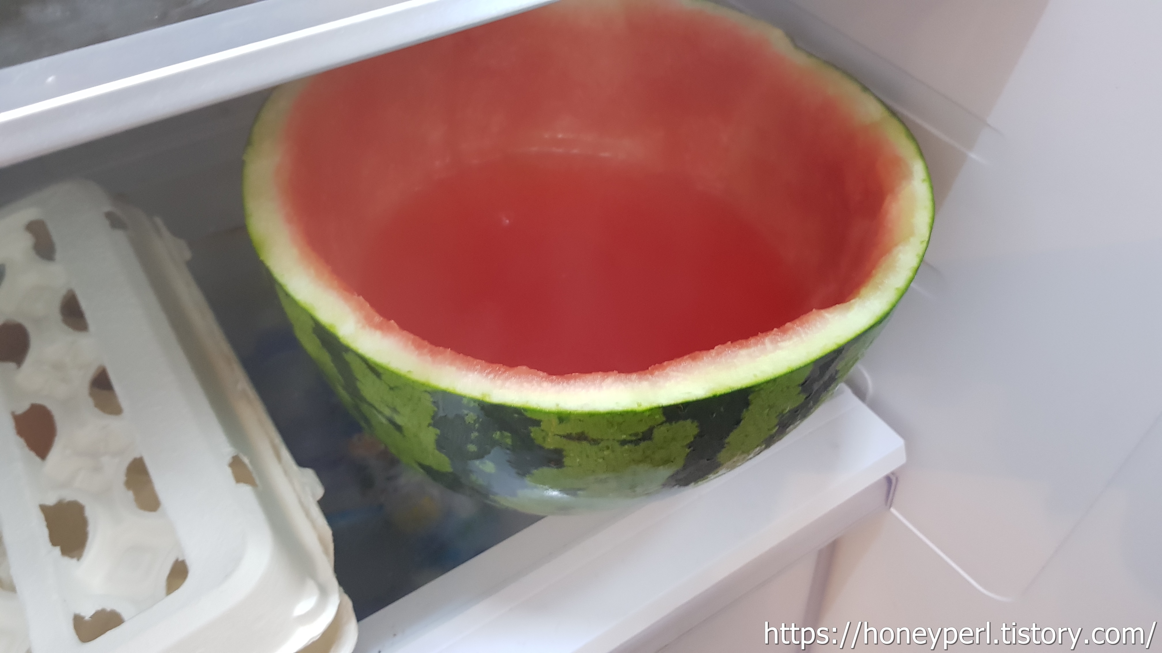 냉장고에 넣을때 그릇을 하나 밑에 넣고 수박껍데기를 올렸어요.