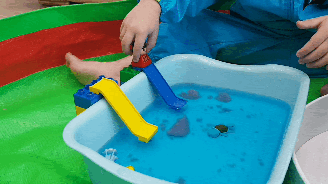 플라스틱 바구니에 파란색 색소를 조금 풀어 놀잇감과 손을 씻어가며 놀 수 있도록 준비해주었어요.