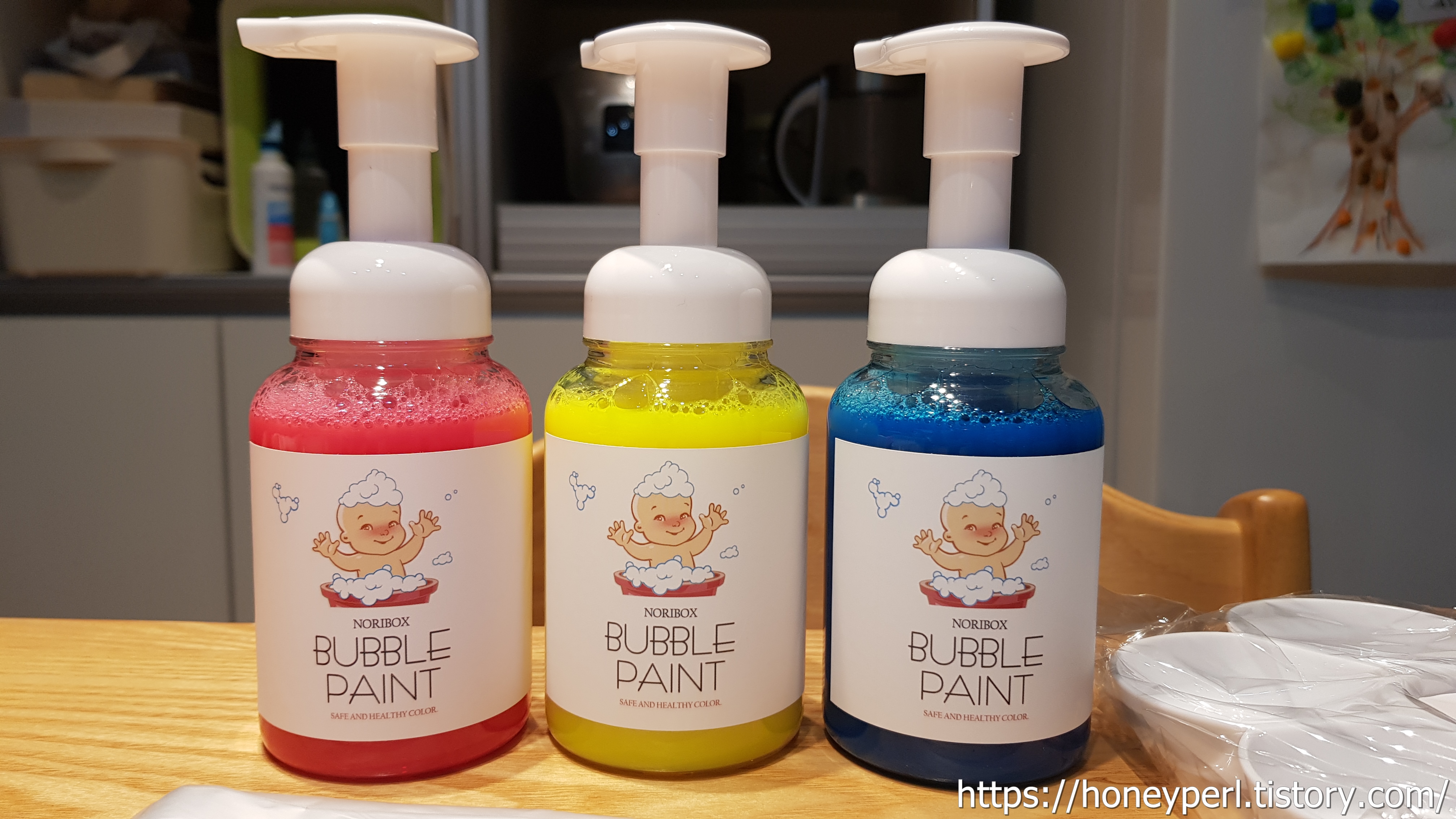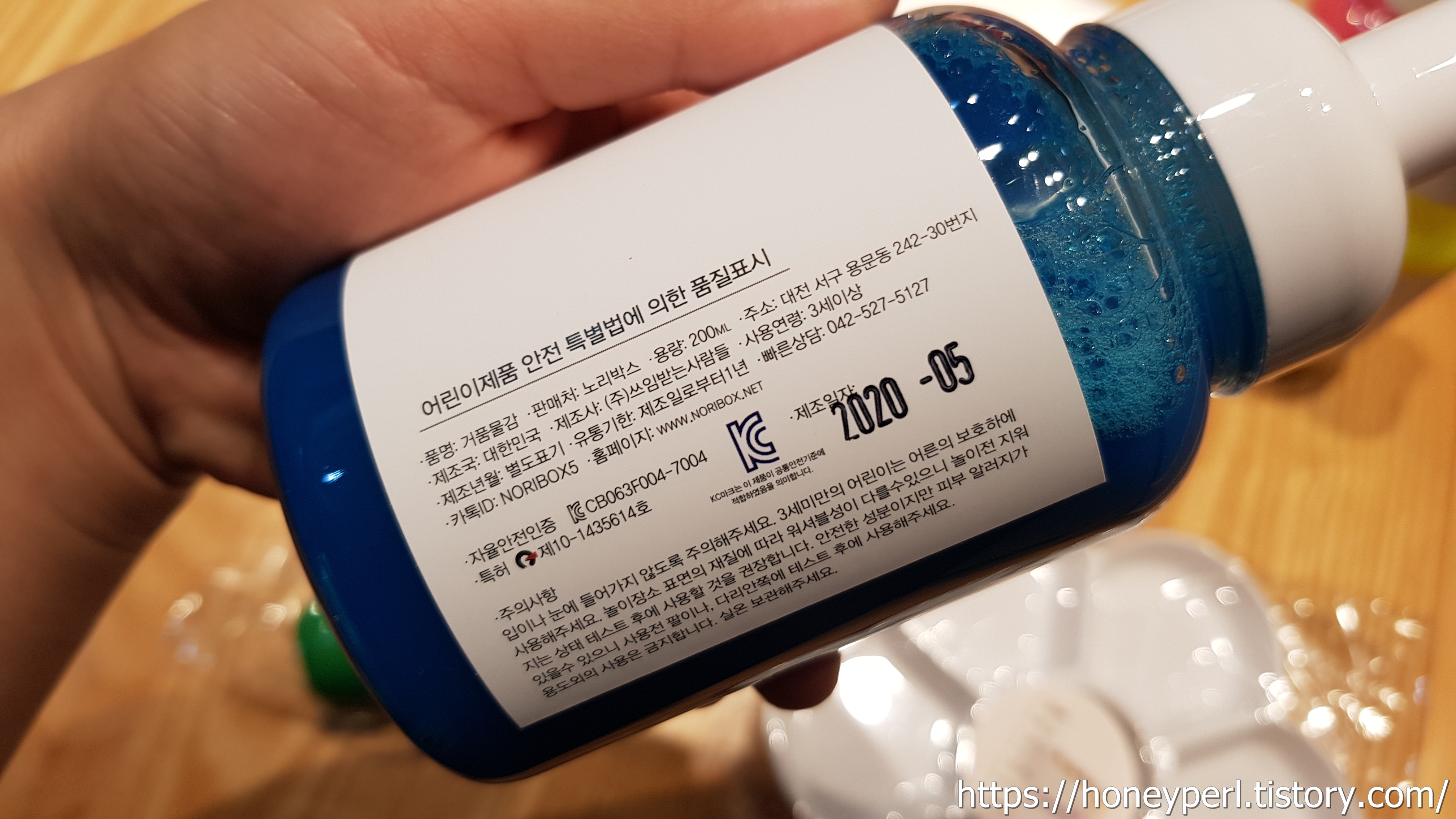 노리박스 버블물감의 경우 1병에 200ml 짜리가 분홍, 노랑, 파랑으로 보내주셨어요.