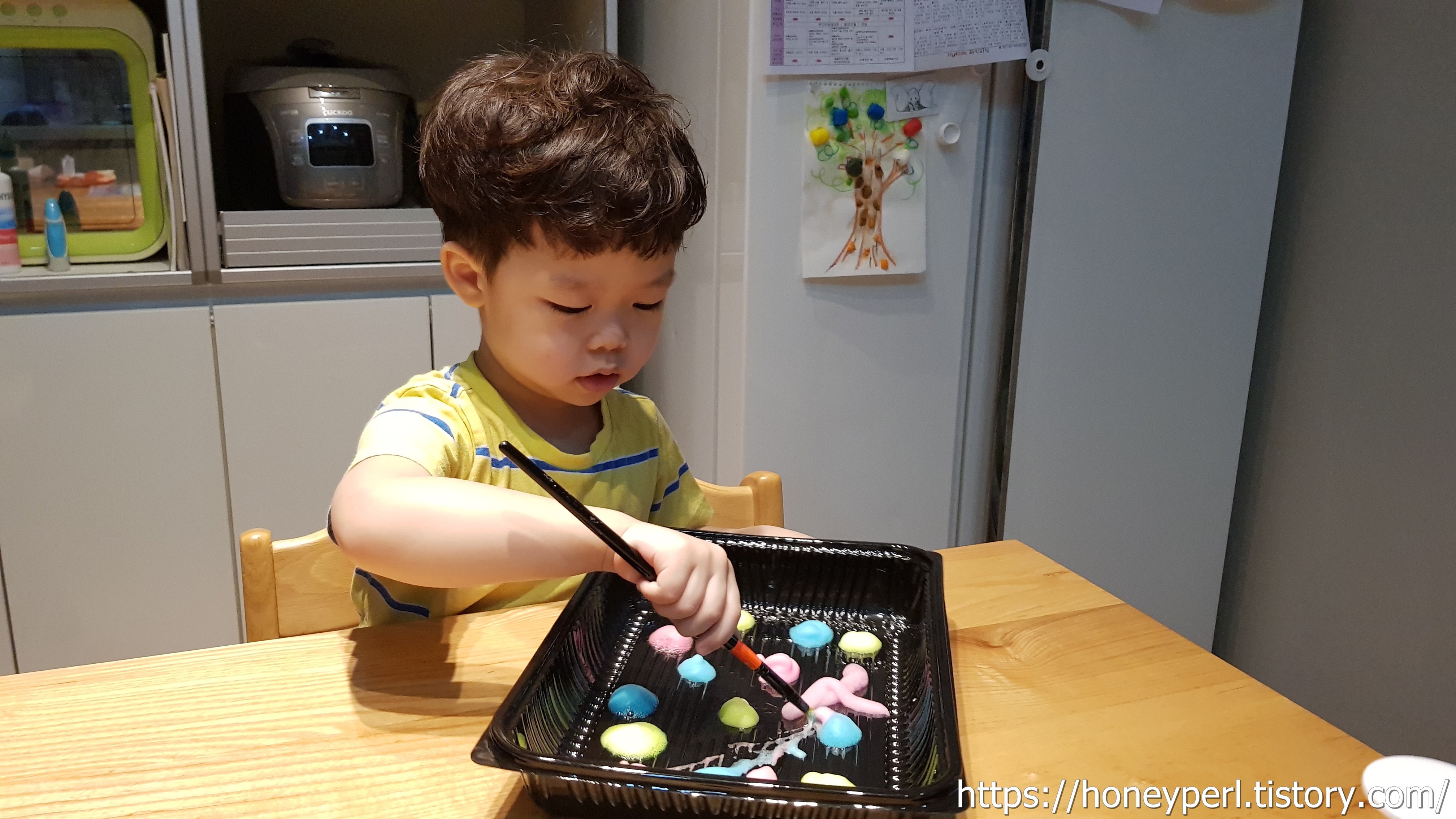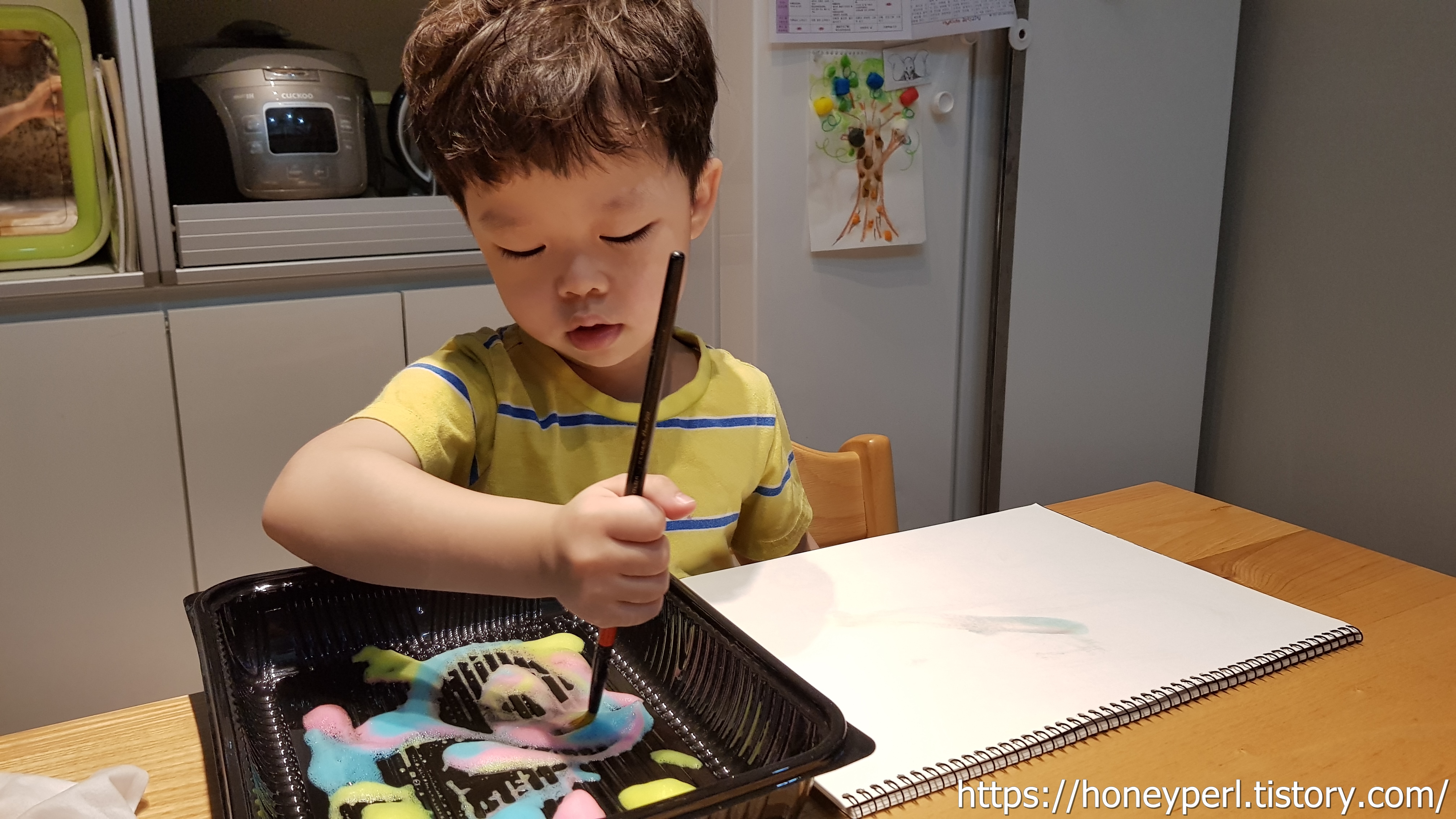 거품물감은 종이에는 연하게 발색되기 때문에 그림그리기용으로는 알맞지 않은것 같구요