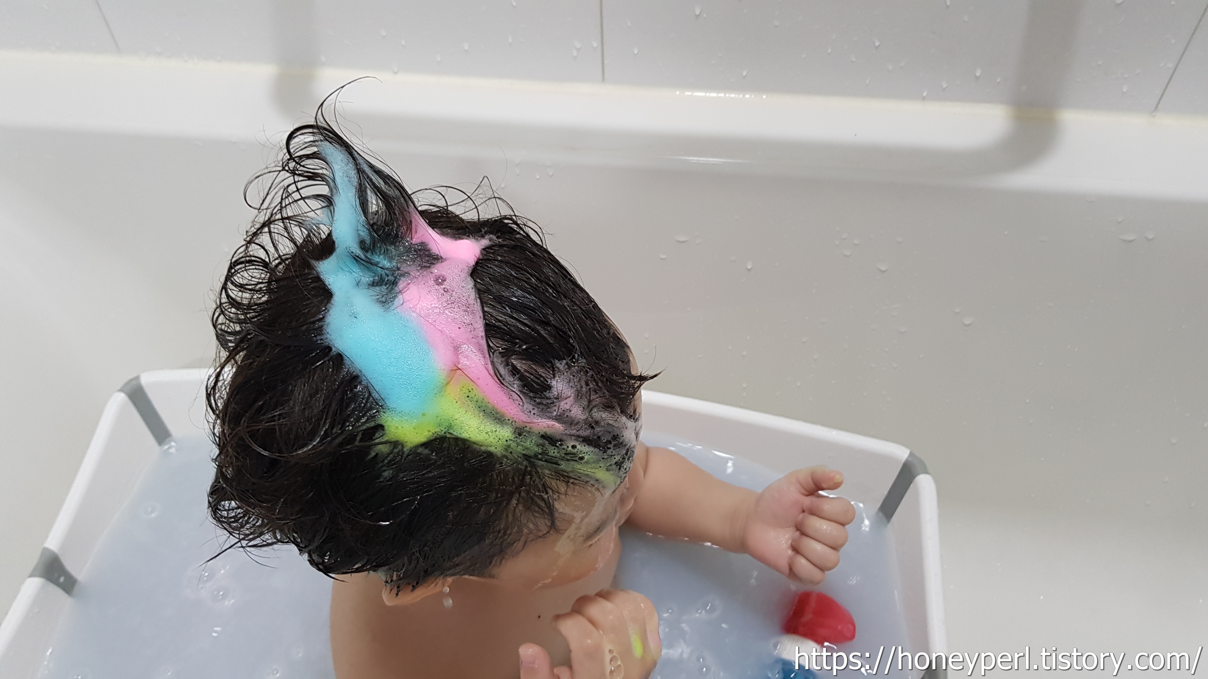 동글이는 거품물감을 목욕놀이에 먼저 사용해봤어요.
