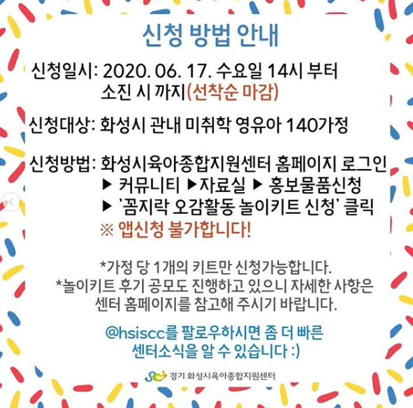 신청대상이 화성시 관내 미취학영유아 140가정이었구요 가정당 1개의 키트만 신청 가능했어요.