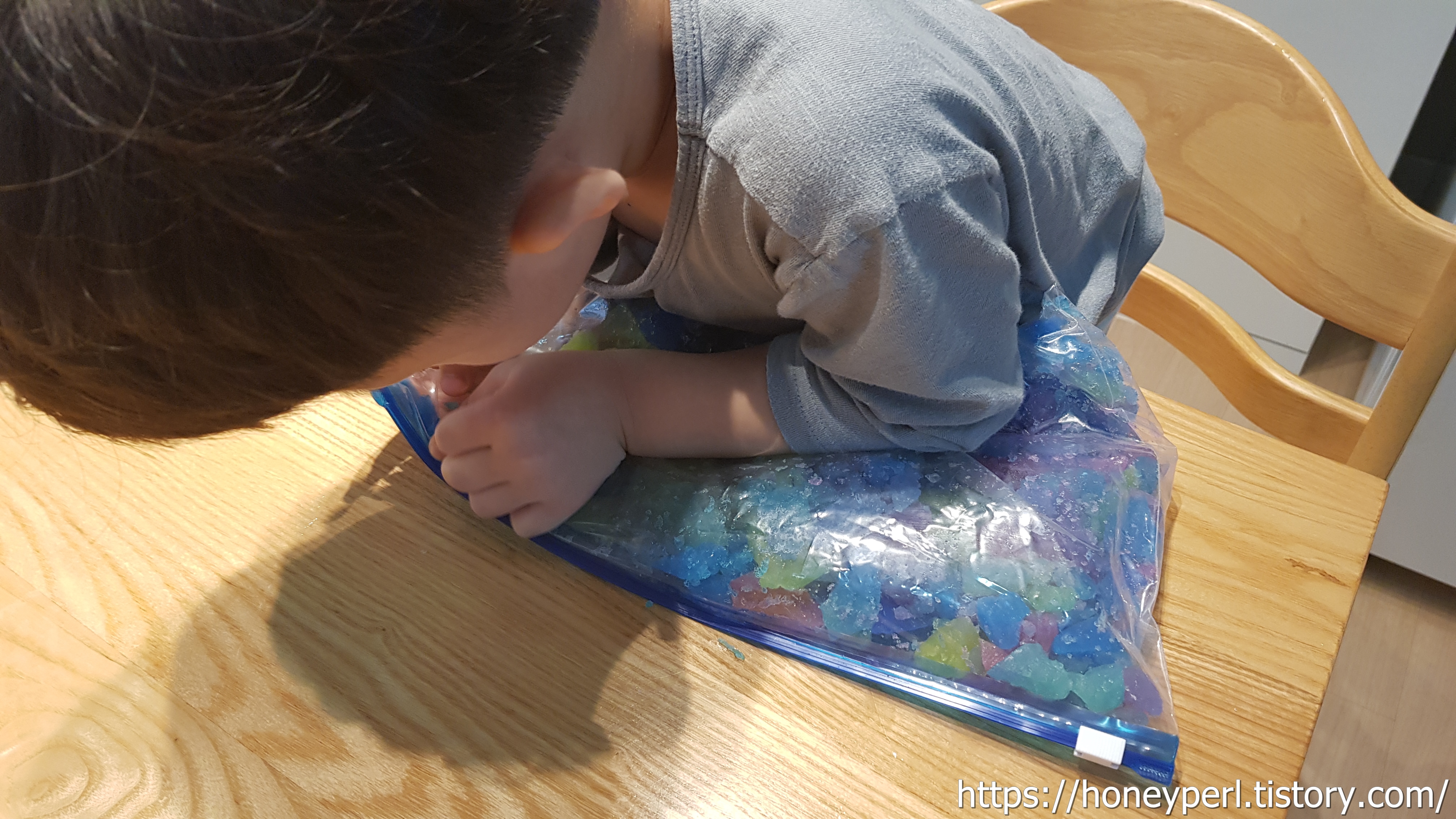 부서진 한천젤리를 센서리백으로 활용해보니 너무 좋더라구요.