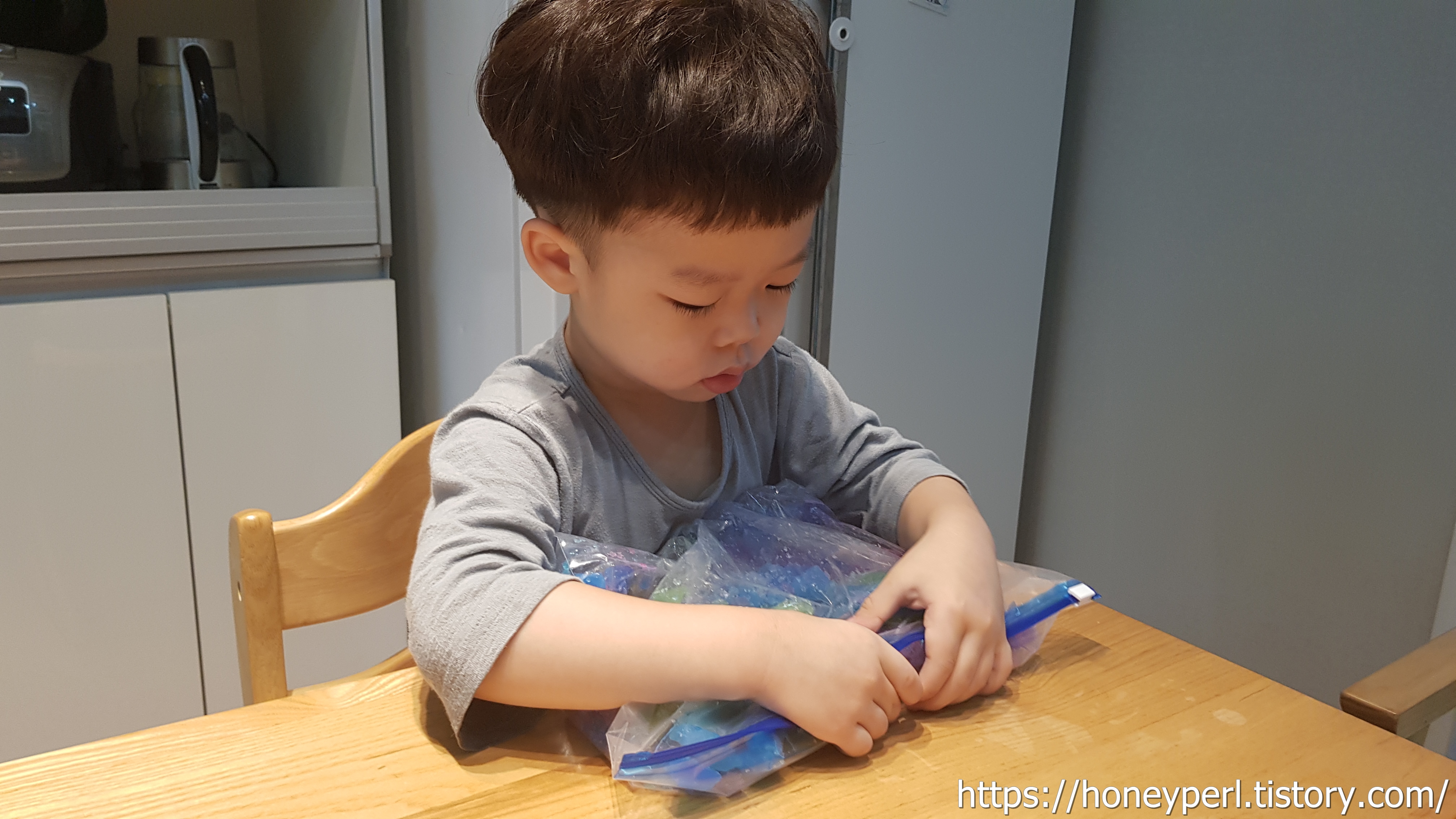 저렇게 칼로도 썰어보고 주물러도 본 한천젤리는 당일에 놀이로 더 하기엔 흥미를 잃은 것 같아 지퍼백에 담아 냉장고에 보관했어요.