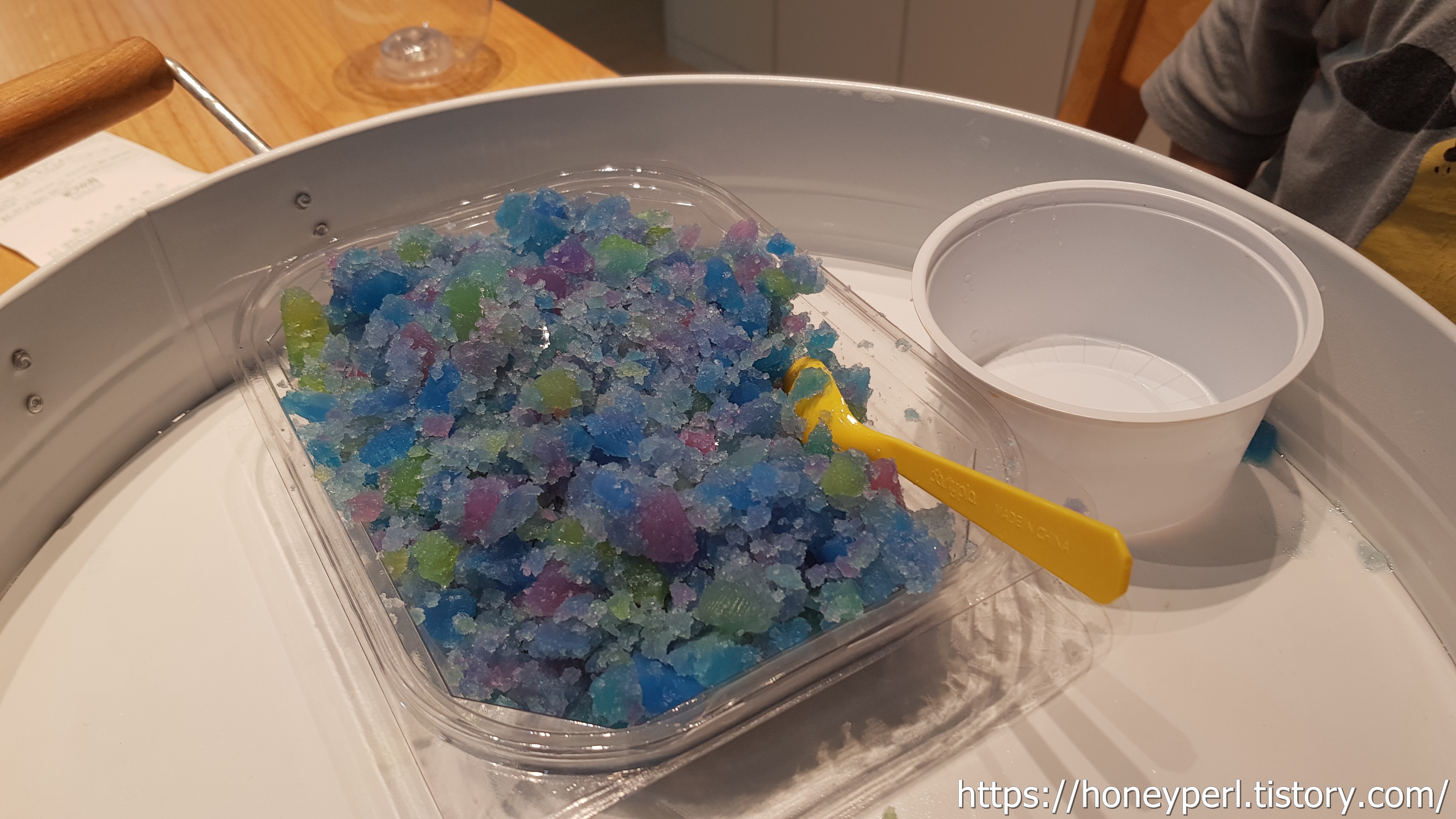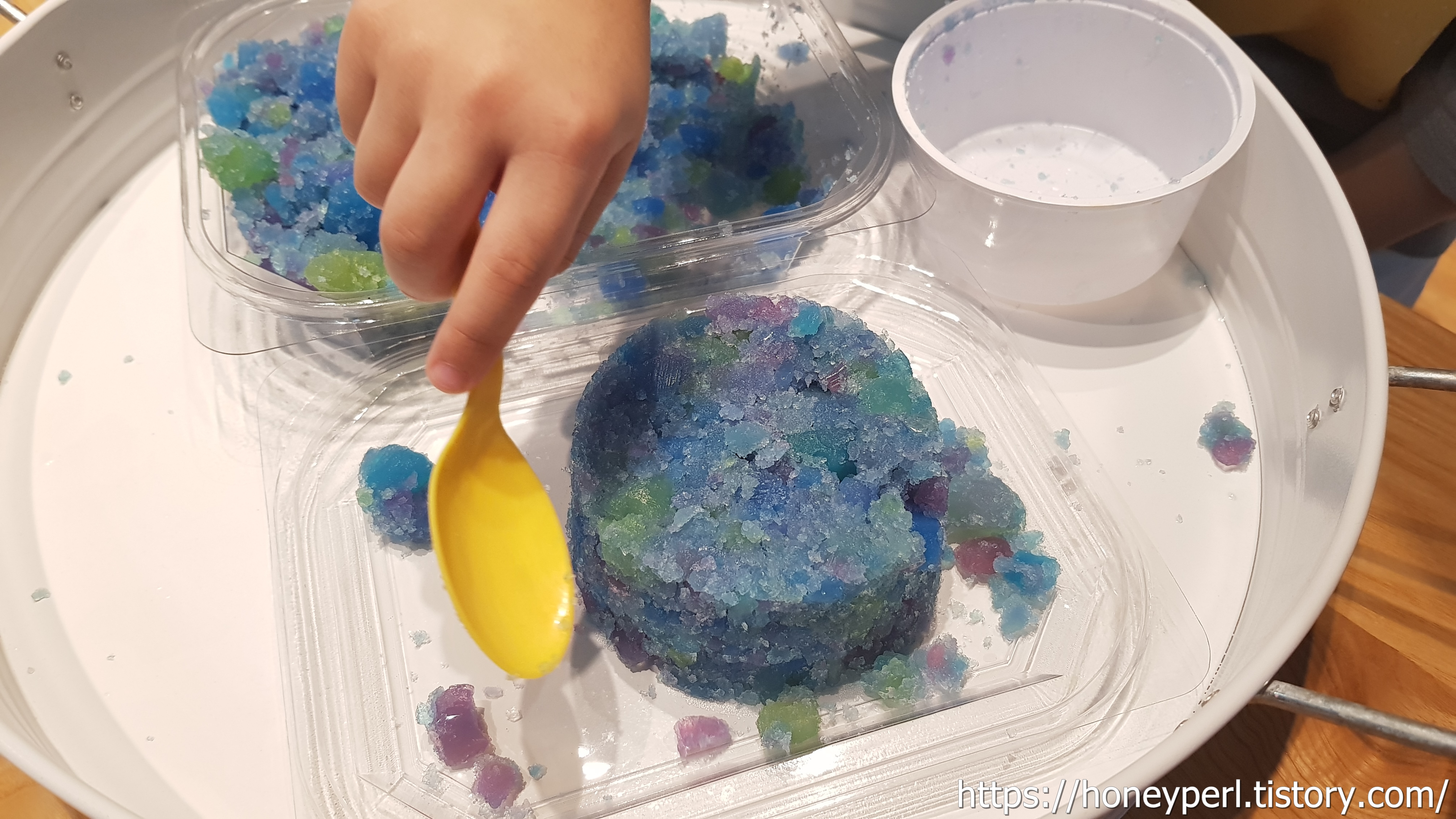 오늘은 한천젤리를 신나게 가지고 놀고나서 으깨진 한천젤리를 활용한 놀이를 소개해볼까 해요.