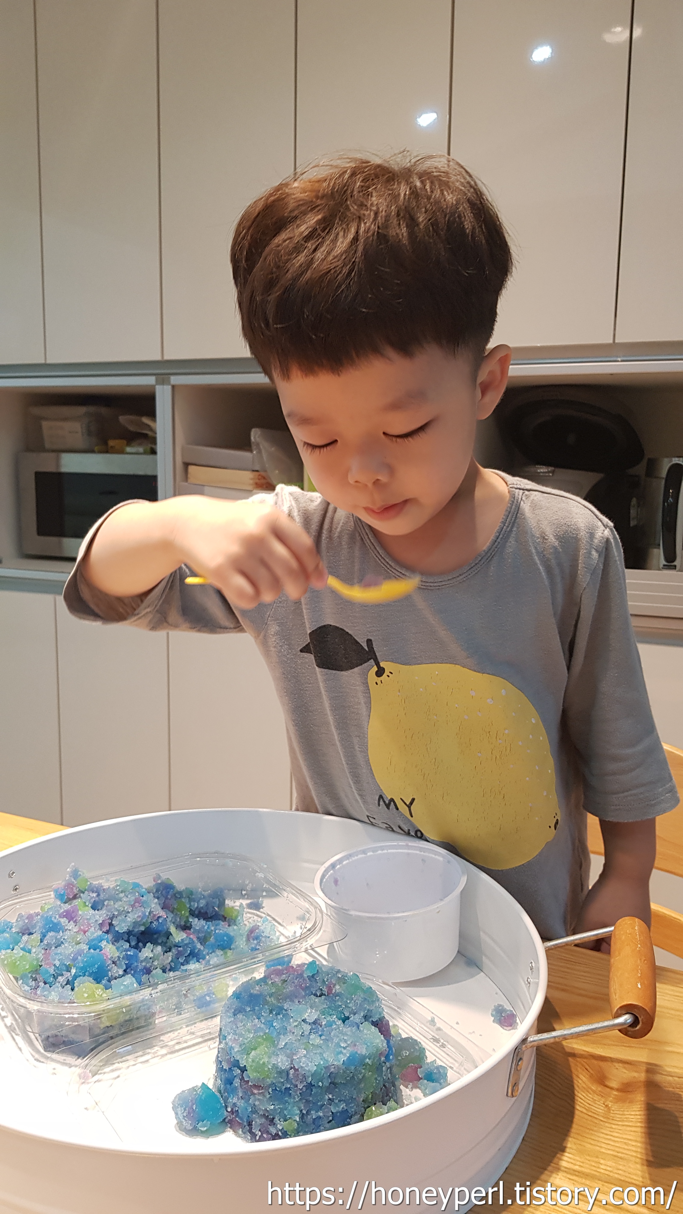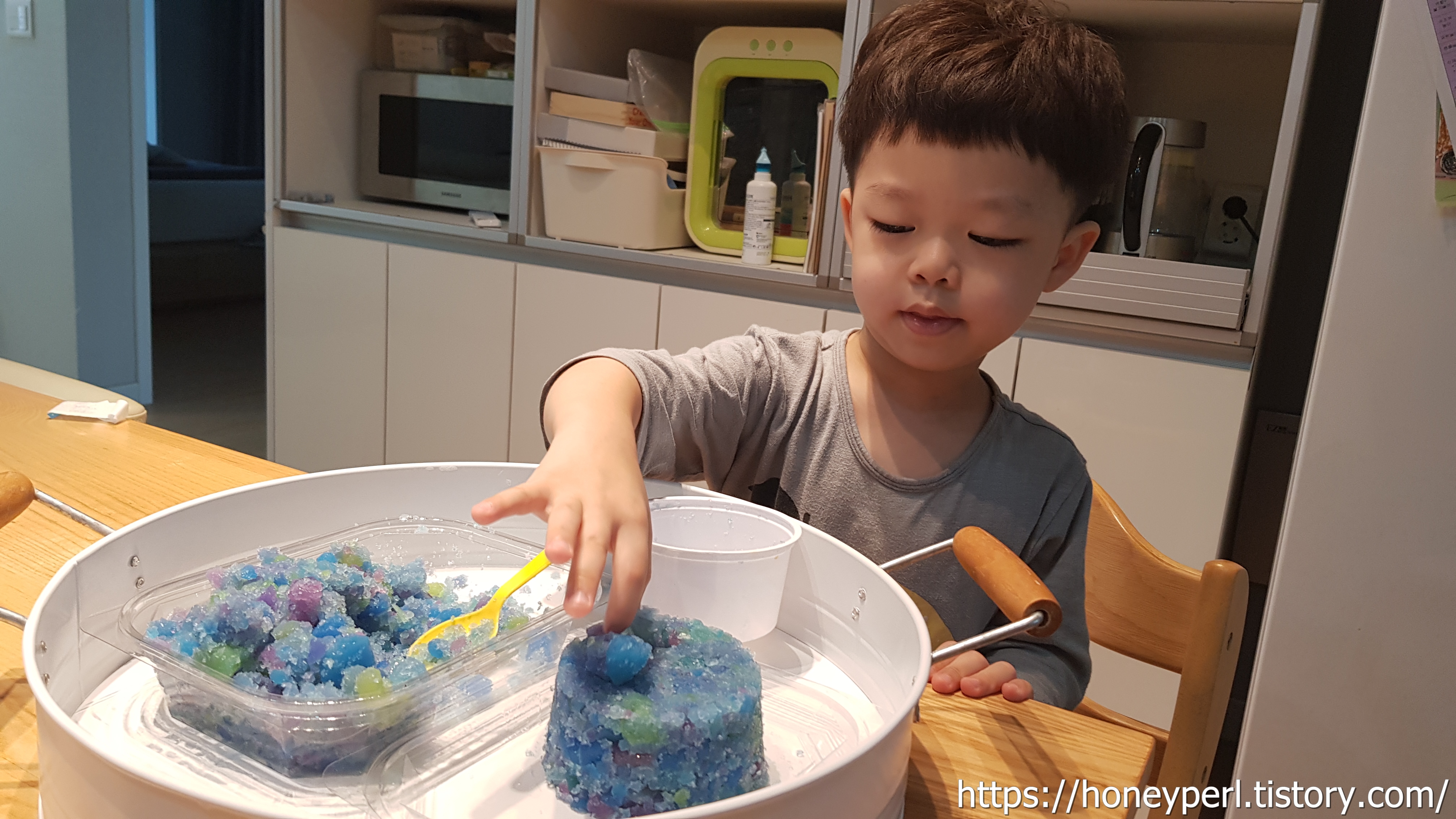동글이가 케이크를 만들어보고 싶다고 해서 동그란 용기에 으깨진 한천젤리를 수저로 꾹꾹 눌러담아주었어요.