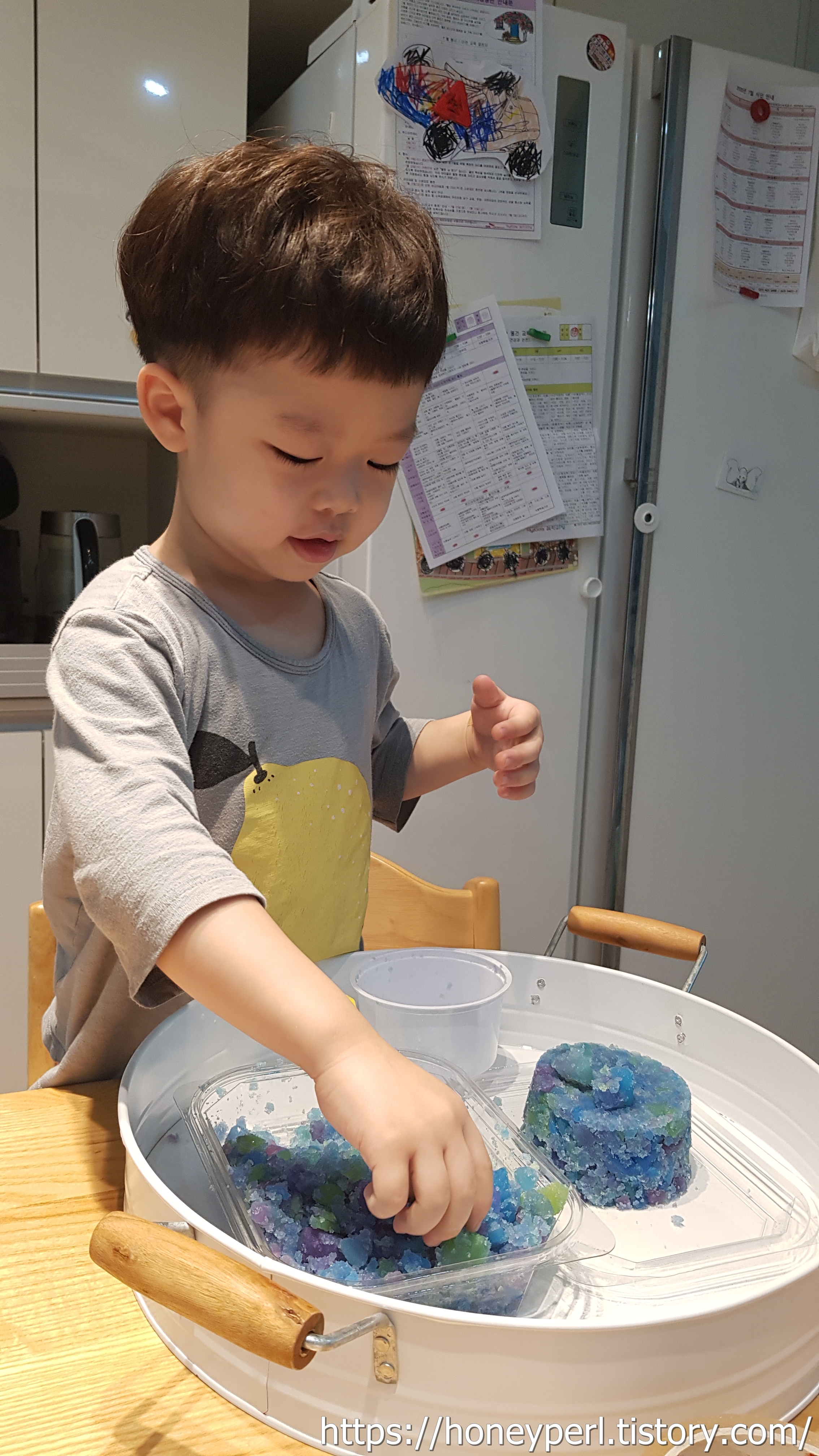 부서진 한천젤리를 센서리백으로 활용해보니 너무 좋더라구요.