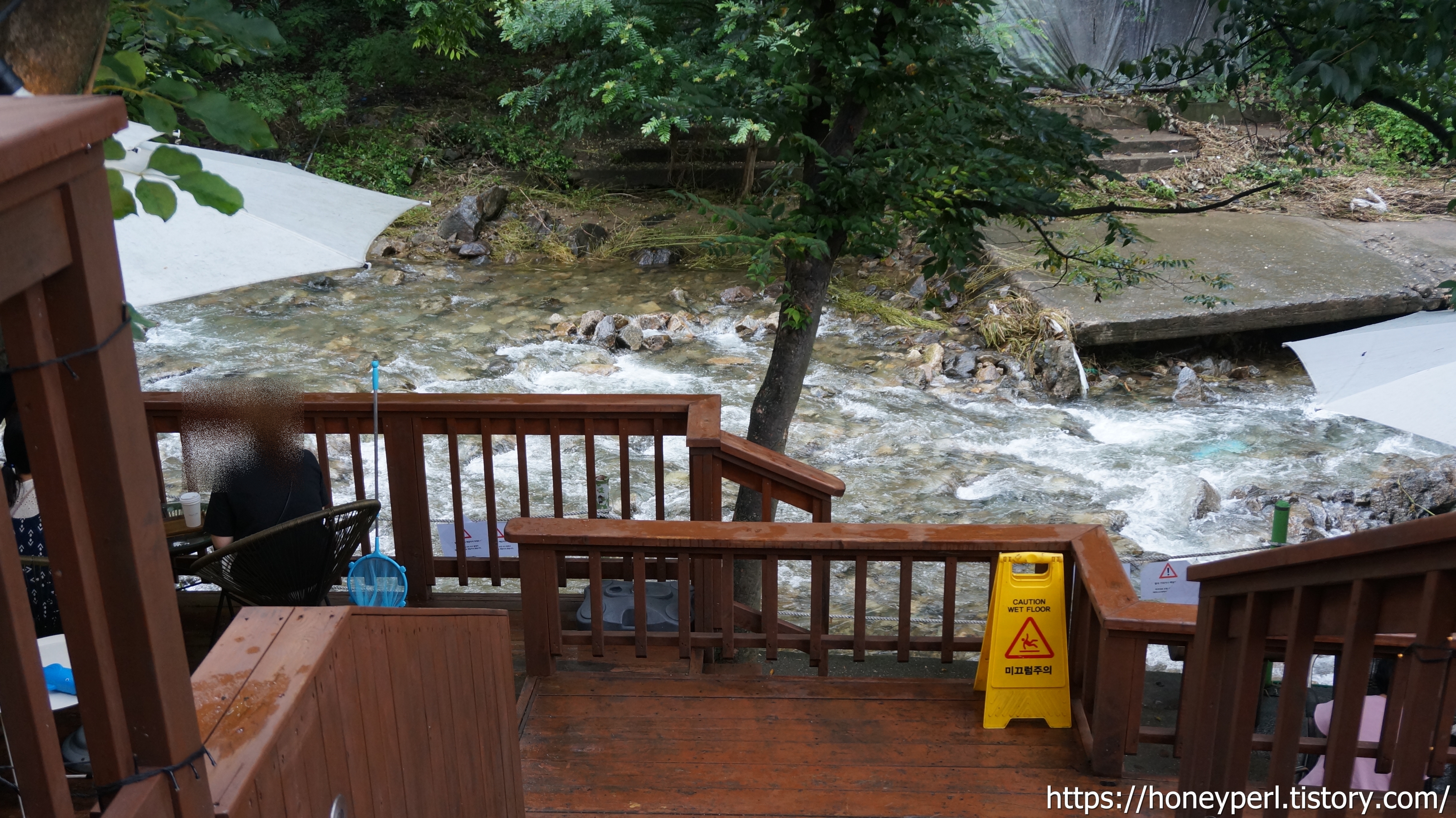 운치있는 테라스 좌석이었는데 흐린날 방문이기도 하고 물놀이하는 아이들을 보니 조금은 소란할 것 같더군요.