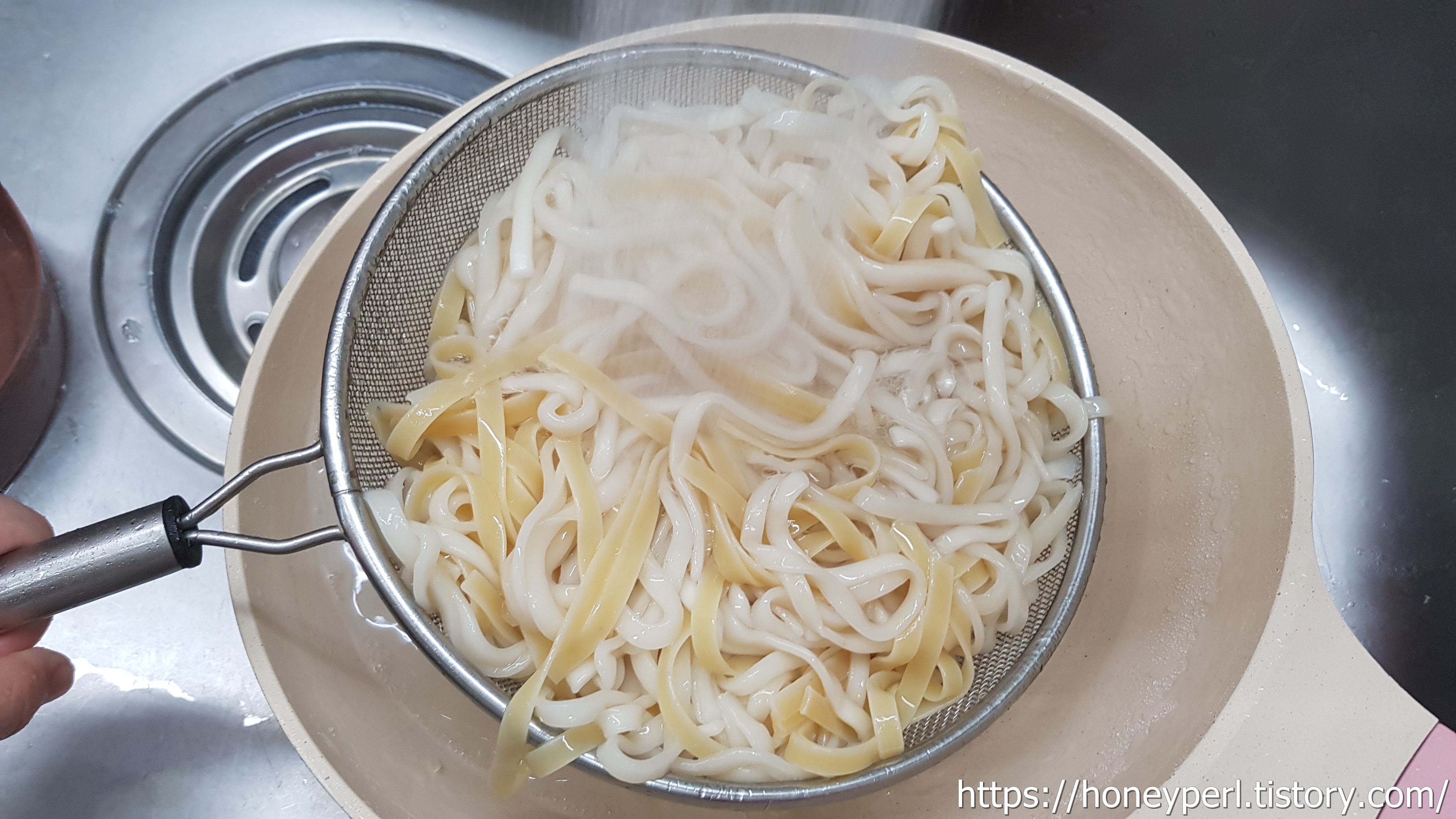 파스타면보다 칼국수 면 삶는 시간이 짧아서 파스타면부터 삶다가 칼국수면을 삶았어요.
