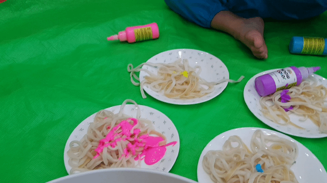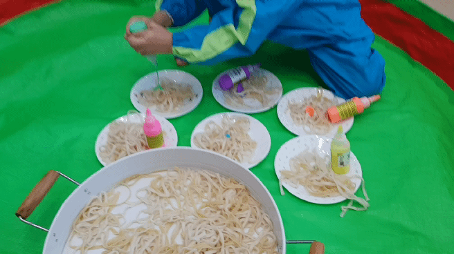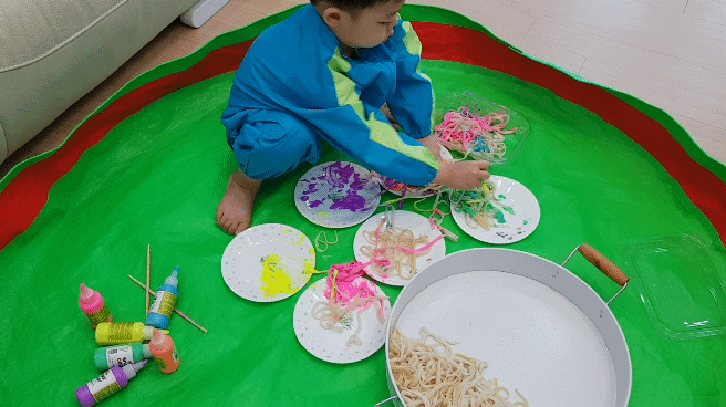 처음에 손으로 면과 물감을 섞이게 해주라고 이야기 했더니 선뜻 손을 내밀지 못하길래 나무젓가락을 주었어요.