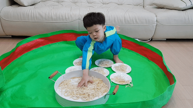 삶아진 면을 만져도 보고 긴 면발을 들어 비가 내린다며 떨어뜨려도 보는 동글이였어요.