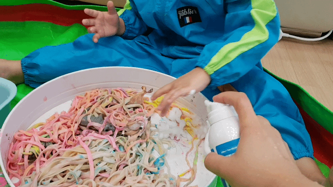 아이 손에 쏙 들어오는 용량이고 사용하기도 편한데 색상도 파스텔형광톤이라 예뻐서 오감놀이에 활용해 보았어요.