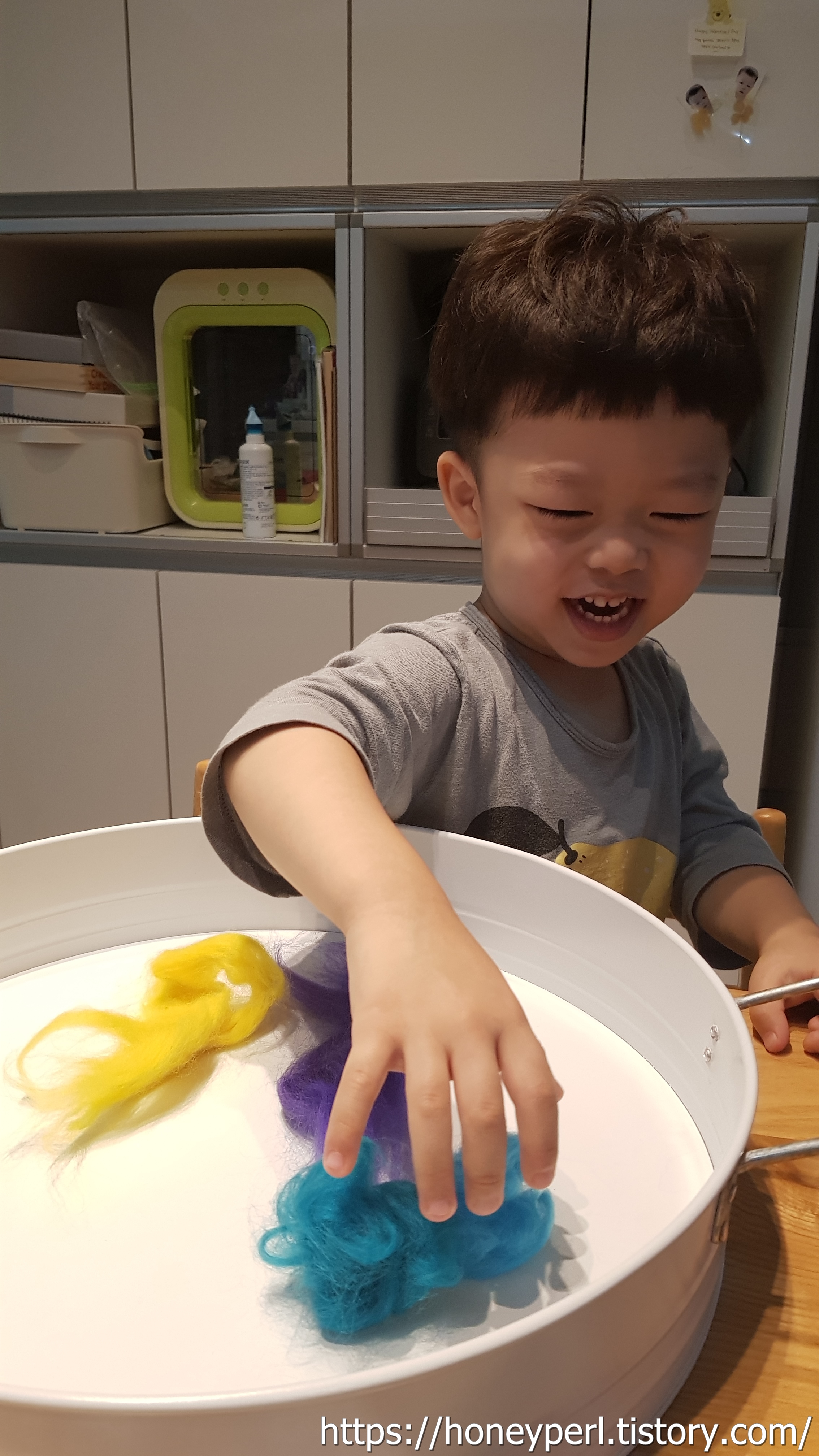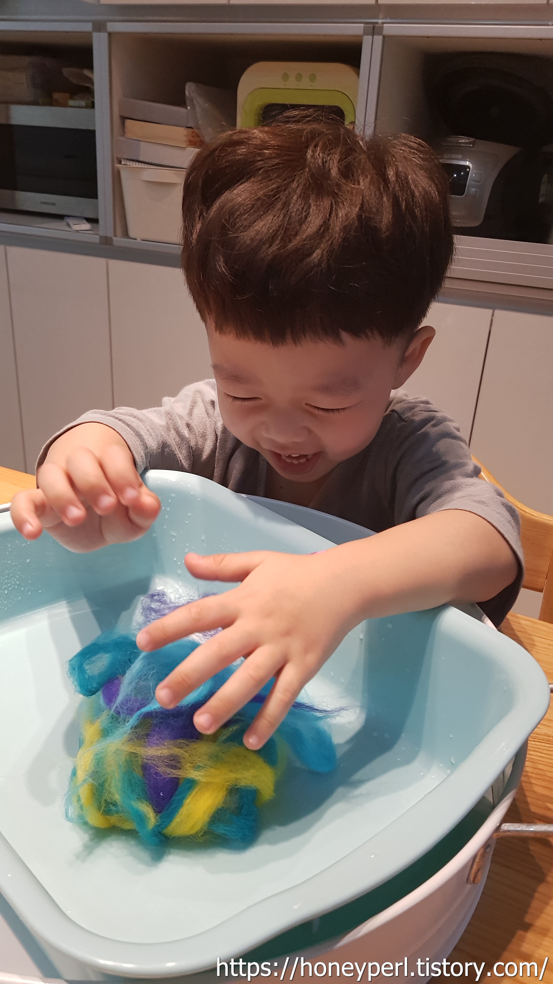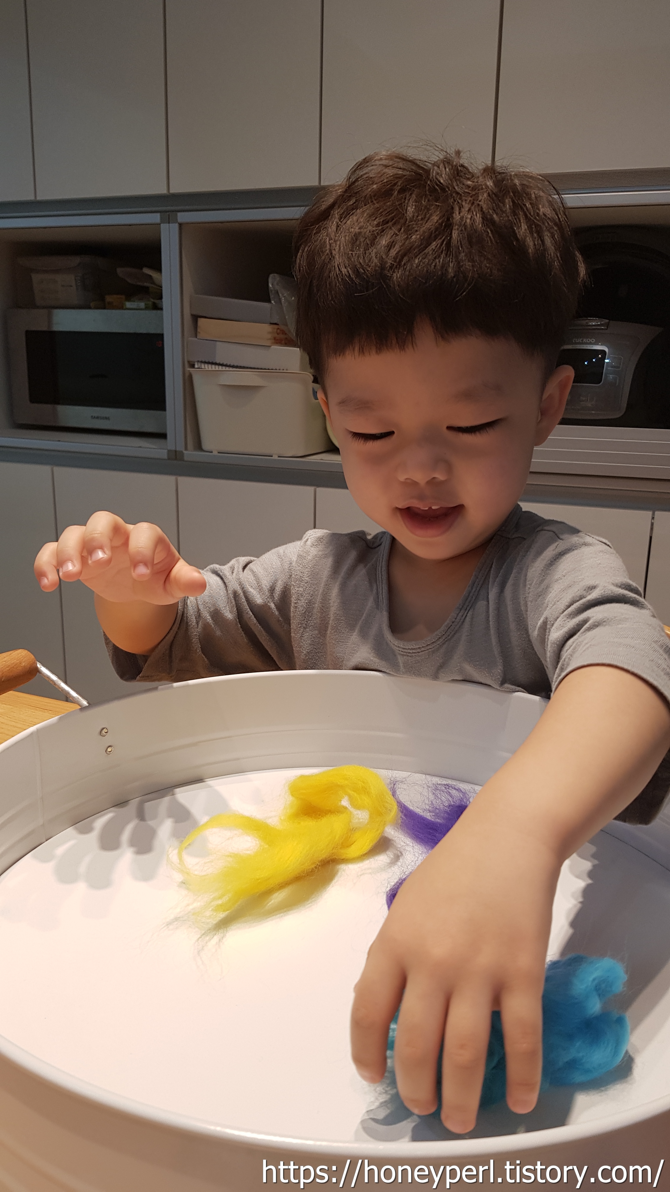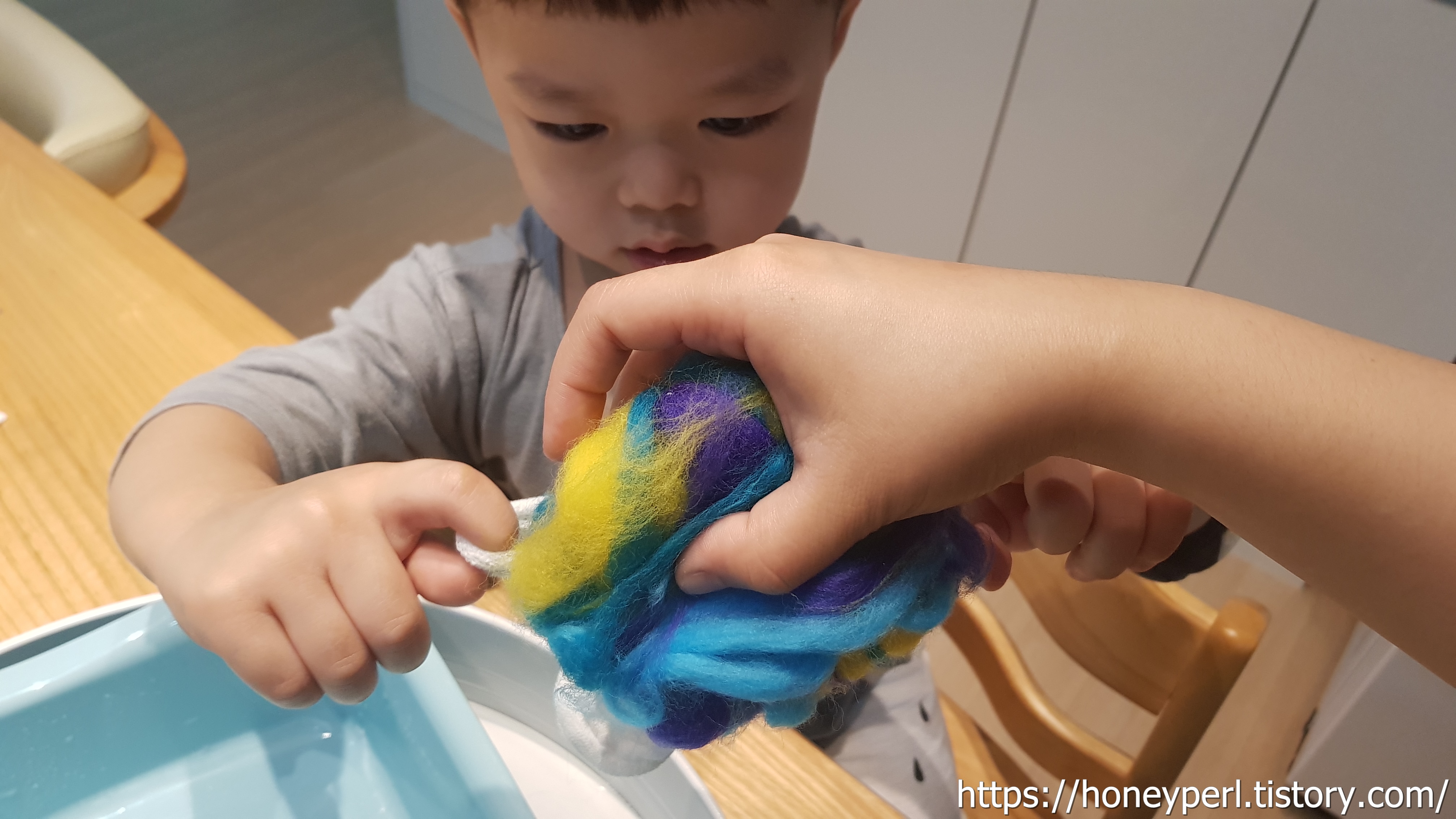발도르프 교육을 접할 기회가 많지 않아서 양모는 놀이재료로 구비해두지 않았었는데 요렇게 만져보니 마음이 몽글몽글 해지는 느낌이 들었답니다.
