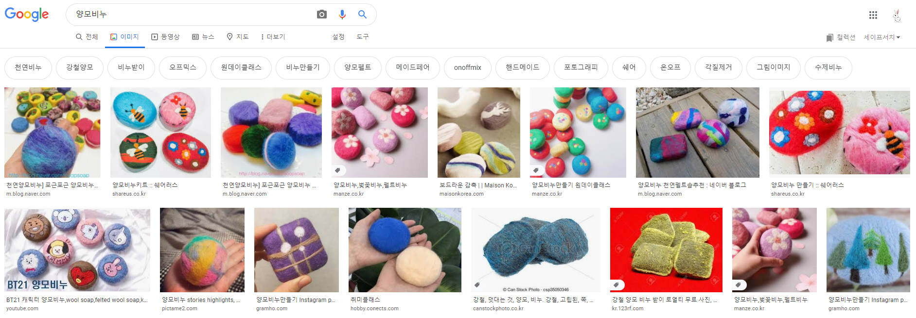 놀이하기에 앞서 양모비누를 검색해보니 폭신폭신하고 귀여운 느낌의 비누공예가 눈에 띄더군요.