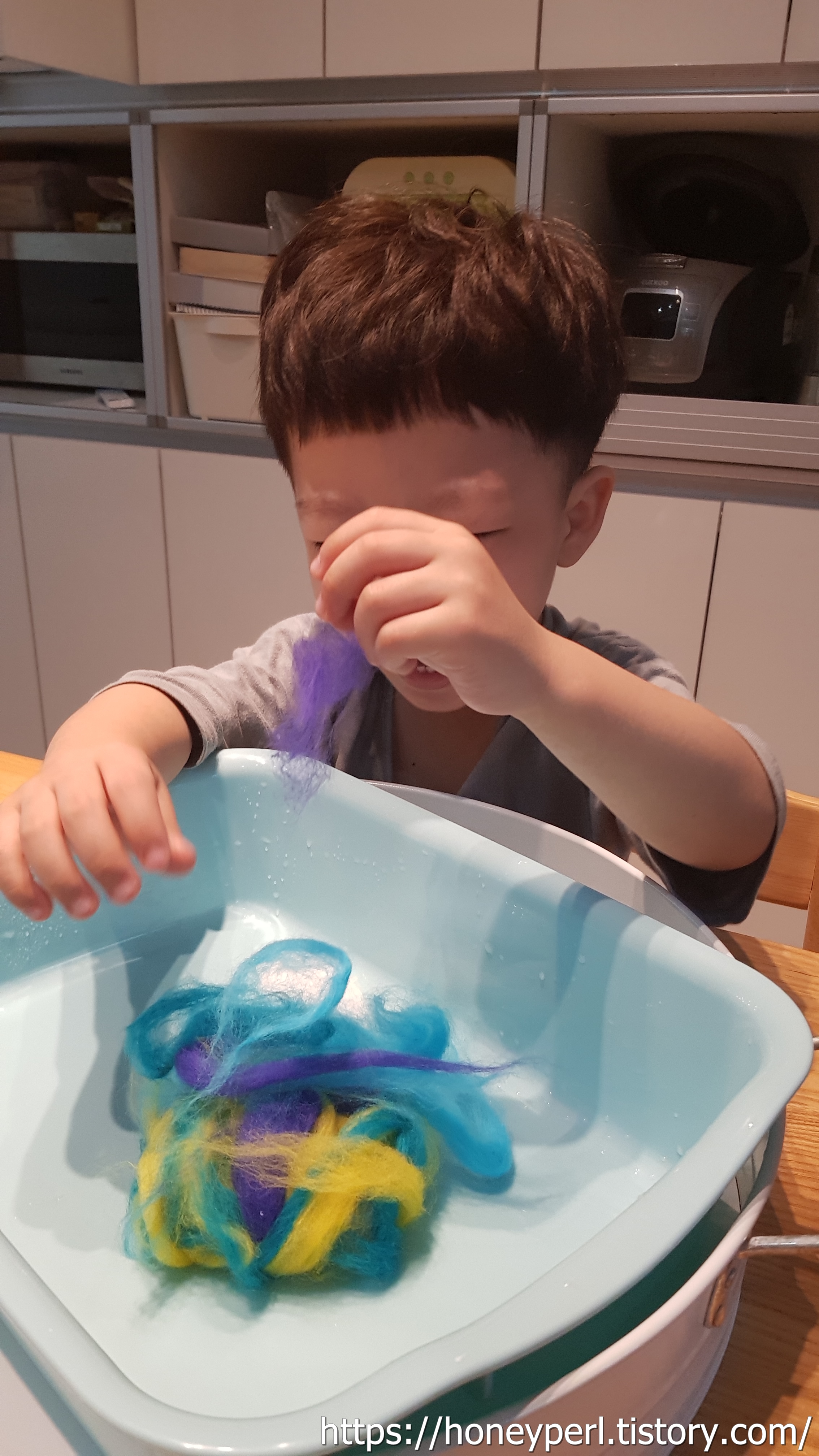 발도르프 교육을 접할 기회가 많지 않아서 양모는 놀이재료로 구비해두지 않았었는데 요렇게 만져보니 마음이 몽글몽글 해지는 느낌이 들었답니다.