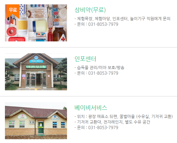 상비약은 무료로 이용 가능하고 체험목장, 체험마당, 인포센터, 놀이기구 직원에 문의하면 된다고 하네요.