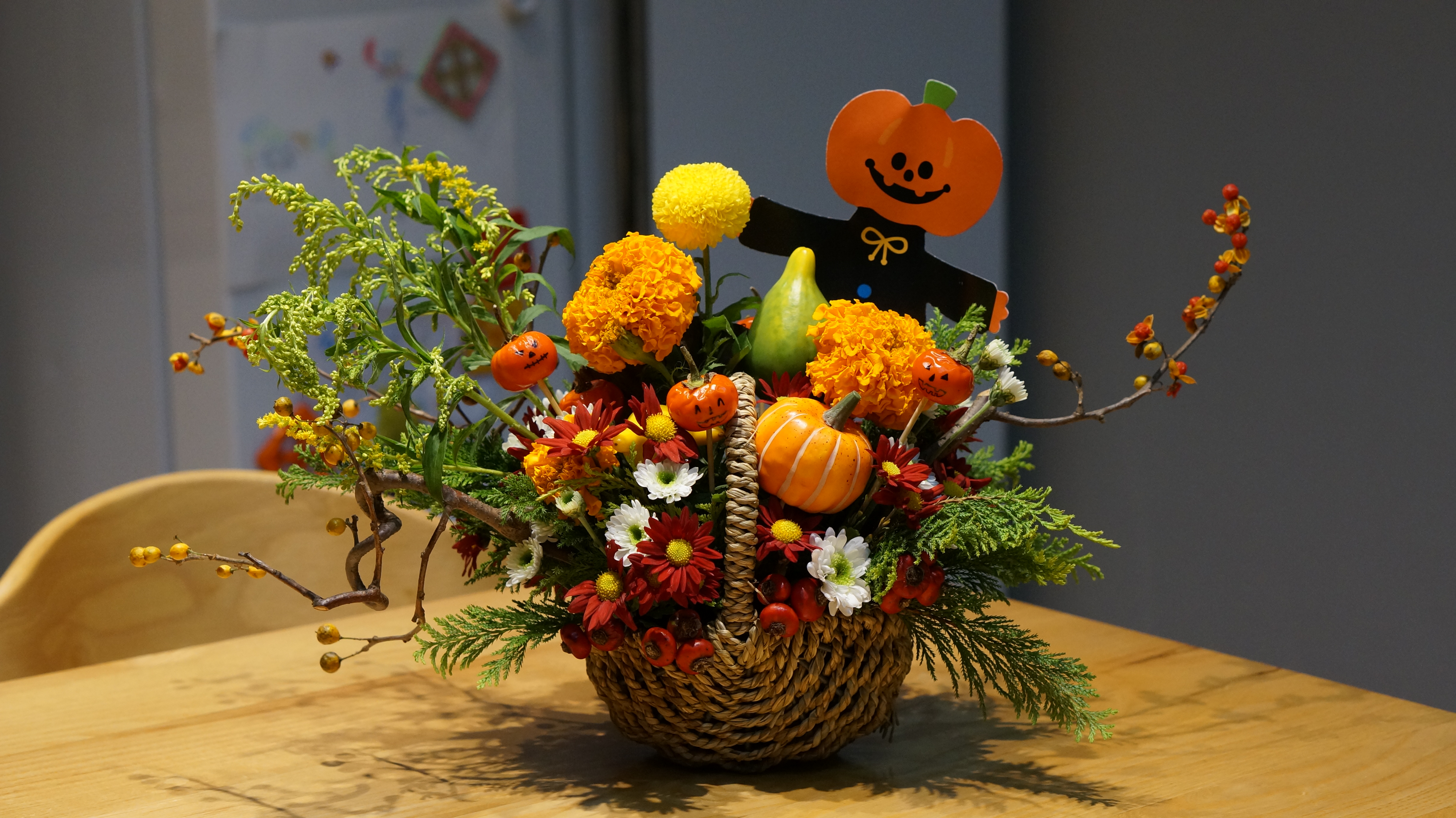 메리골드와 퐁퐁국화, 소국, 노박덩굴, 할로윈장식까지 꽂아 완성!
